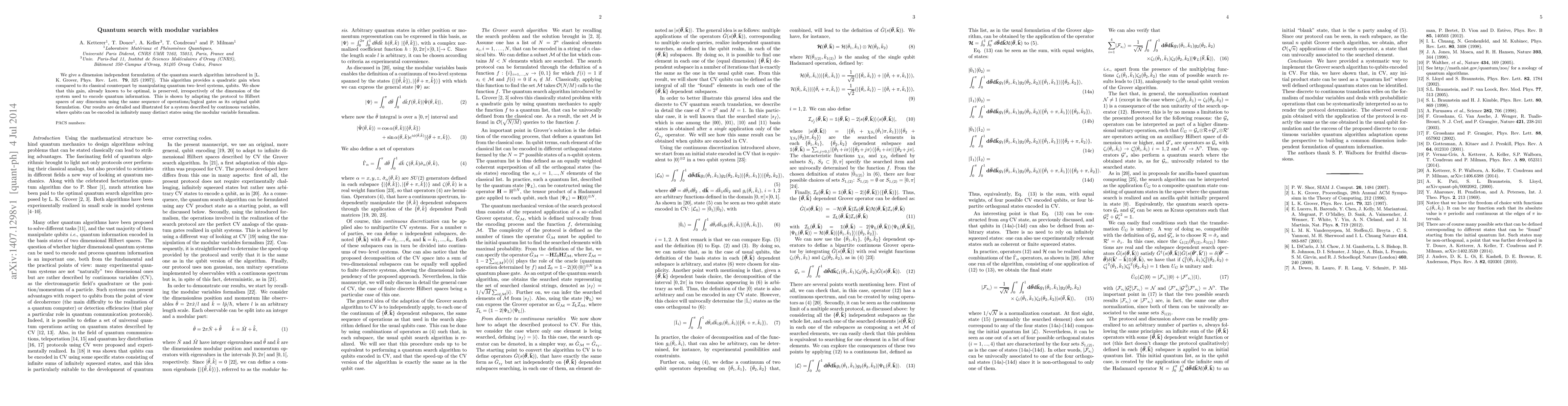 We give a dimension independent formulation of the quantum search algorithm introduced in [L. K. Grover, Phys. Rev. Lett. {\bf 79}, 325 (1997)]. This algorithm provides a quadratic gain when compared to its classical counterpart by manipulating quantum two--level systems, qubits. We show that this gain, already known to be optimal, is preserved, irrespectively of the dimension of the system used to encode quantum information. This is shown by adapting the protocol to Hilbert spaces of any dimension using the same sequence of operations/logical gates as its original qubit formulation. Our results are detailed and illustrated for a system described by continuous variables, where qubits can be encoded in infinitely many distinct states using the modular variable formalism.