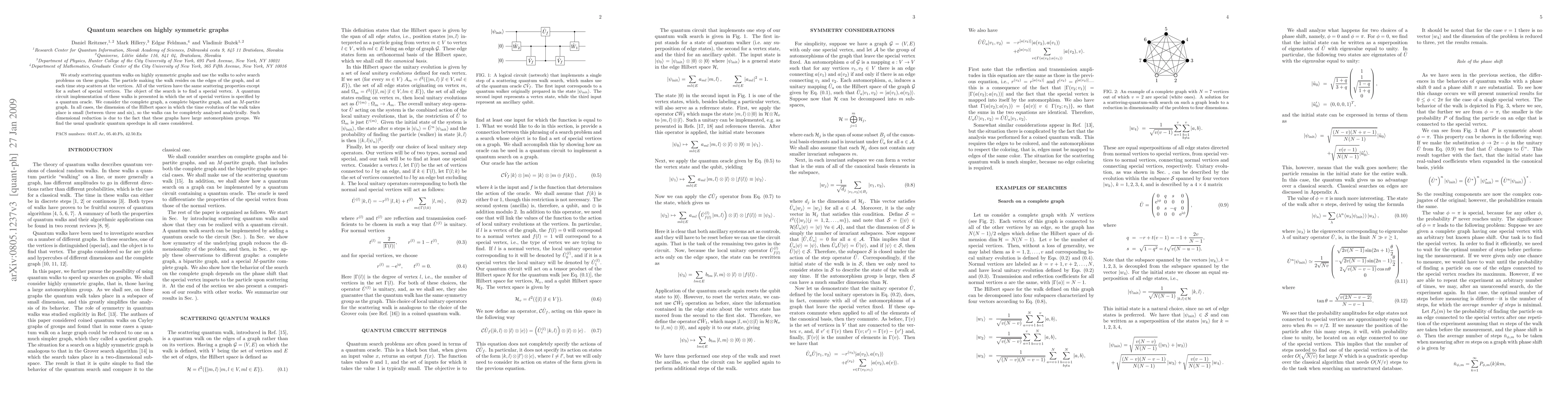 This paper investigates quantum walks on highly symmetric graphs to solve search problems, achieving quadratic speedups due to the graphs' large automorphism groups. The quantum circuit implementation uses a quantum oracle to identify special vertices, with analytical analysis facilitated by the small Hilbert space dimensions.