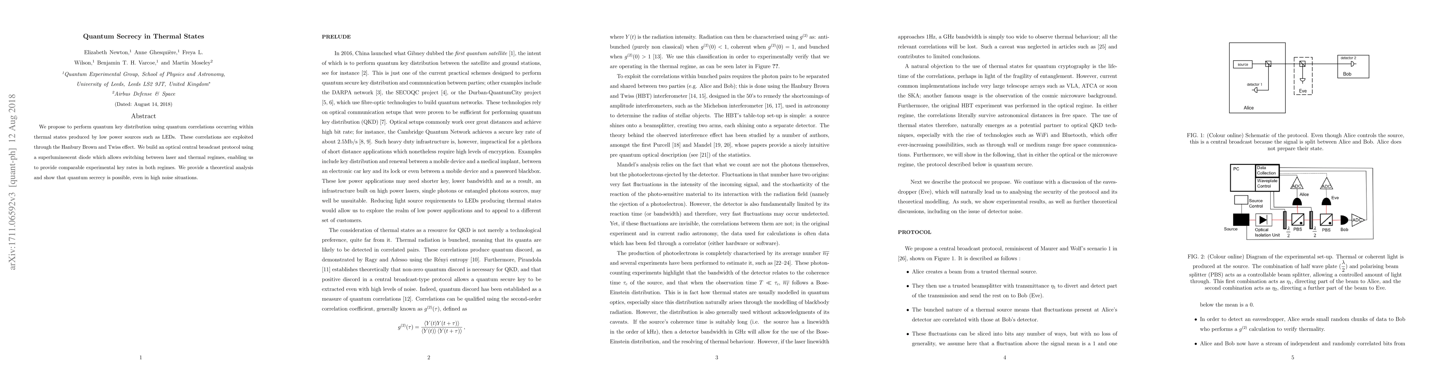 We propose to perform quantum key distribution using quantum correlations occurring within thermal states produced by low power sources such as LED's. These correlations are exploited through the Hanbury Brown and Twiss effect. We build an optical central broadcast protocol using a superluminescent diode which allows switching between laser and thermal regimes, enabling us to provide experimental key rates in both regimes. We provide a theoretical analysis and show that quantum secrecy is possible, even in high noise situations.