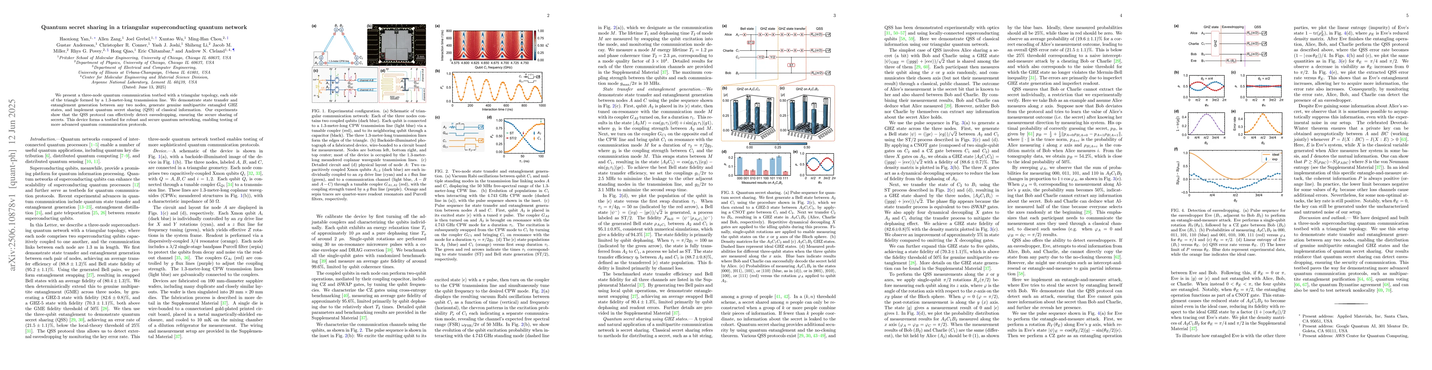 The paper presents a novel approach to quantum secret sharing using a triangular superconducting quantum network, demonstrating state transfer, entanglement generation, and secure classical information sharing.