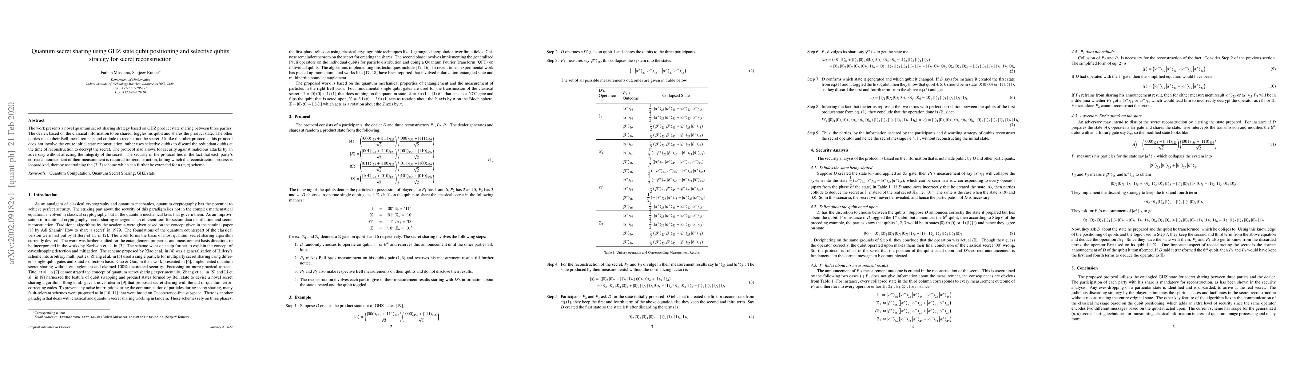 A new approach to quantum secret sharing using GHZ state qubit positioning and selective qubits strategy.