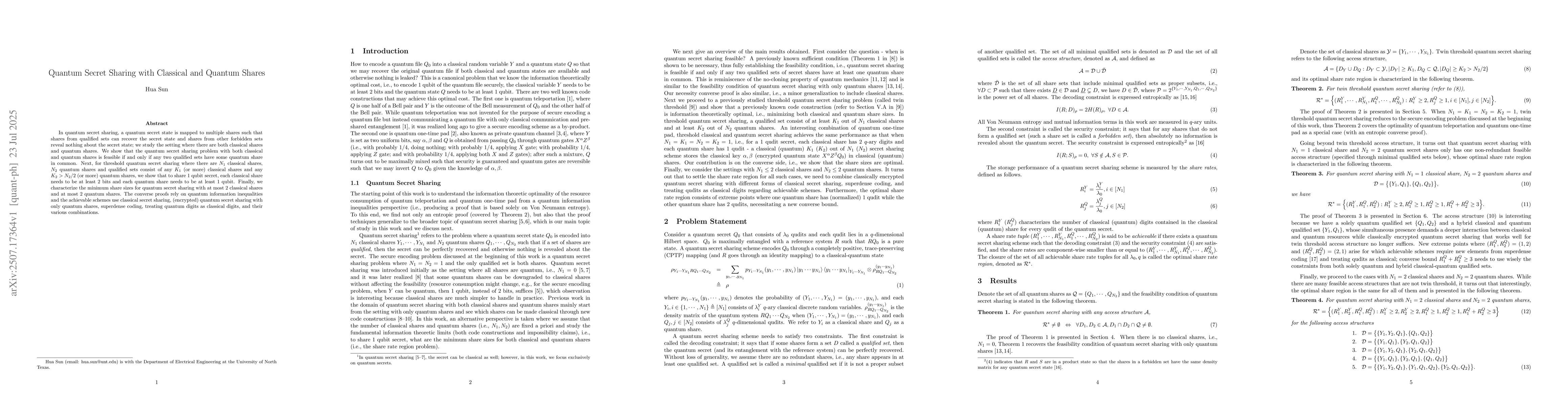 In quantum secret sharing, a quantum secret state is mapped to multiple shares such that shares from qualified sets can recover the secret state and shares from other forbidden sets reveal nothing about the secret state; we study the setting where there are both classical shares and quantum shares. We show that the quantum secret sharing problem with both classical and quantum shares is feasible if and only if any two qualified sets have some quantum share in common. Next, for threshold quantum secret sharing where there are $N_1$ classical shares, $N_2$ quantum shares and qualified sets consist of any $K_1$ (or more) classical shares and any $K_2 > N_2/2$ (or more) quantum shares, we show that to share $1$ qubit secret, each classical share needs to be at least $2$ bits and each quantum share needs to be at least $1$ qubit. Finally, we characterize the minimum share sizes for quantum secret sharing with at most $2$ classical shares and at most $2$ quantum shares. The converse proofs rely on quantum information inequalities and the achievable schemes use classical secret sharing, (encrypted) quantum secret sharing with only quantum shares, superdense coding, treating quantum digits as classical digits, and their various combinations.