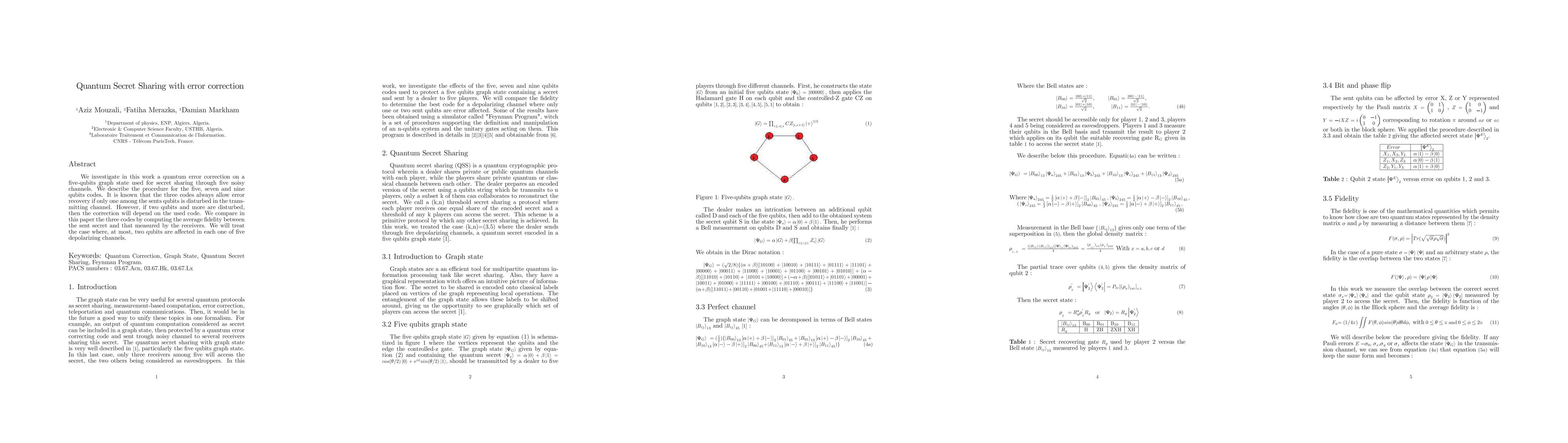 This paper explores quantum error correction on a five-qubit graph state for secret sharing across five noisy channels, detailing procedures for five, seven, and nine qubits codes. While single-qubit disturbances can always be corrected, multiple disturbances depend on the specific code used.