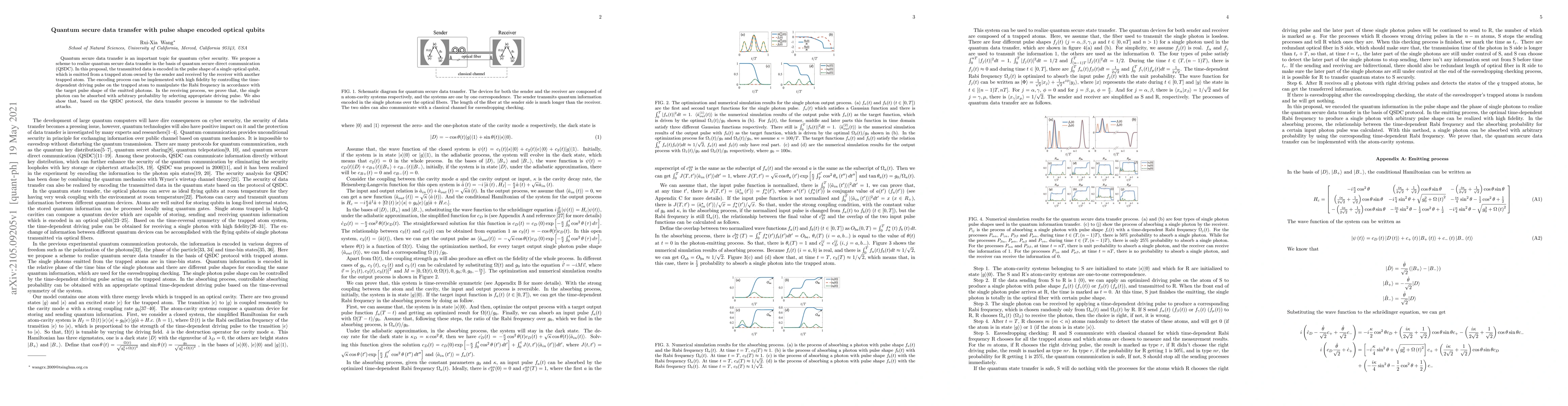 Quantum secure data transfer is an important topic for quantum cyber security. We propose a scheme to realize quantum secure data transfer in the basis of quantum secure direct communication (QSDC). In this proposal, the transmitted data is encoded in the pulse shape of a single optical qubit, which is emitted from a trapped atom owned by the sender and received by the receiver with another trapped atom. The encoding process can be implemented with high fidelity by controlling the time-dependent driving pulse on the trapped atom to manipulate the Rabi frequency in accordance with the target pulse shape of the emitted photons. In the receiving process, we prove that, the single photon can be absorbed with arbitrary probability by selecting appropriate driving pulse. We also show that, based on the QSDC protocol, the data transfer process is immune to the individual attacks.