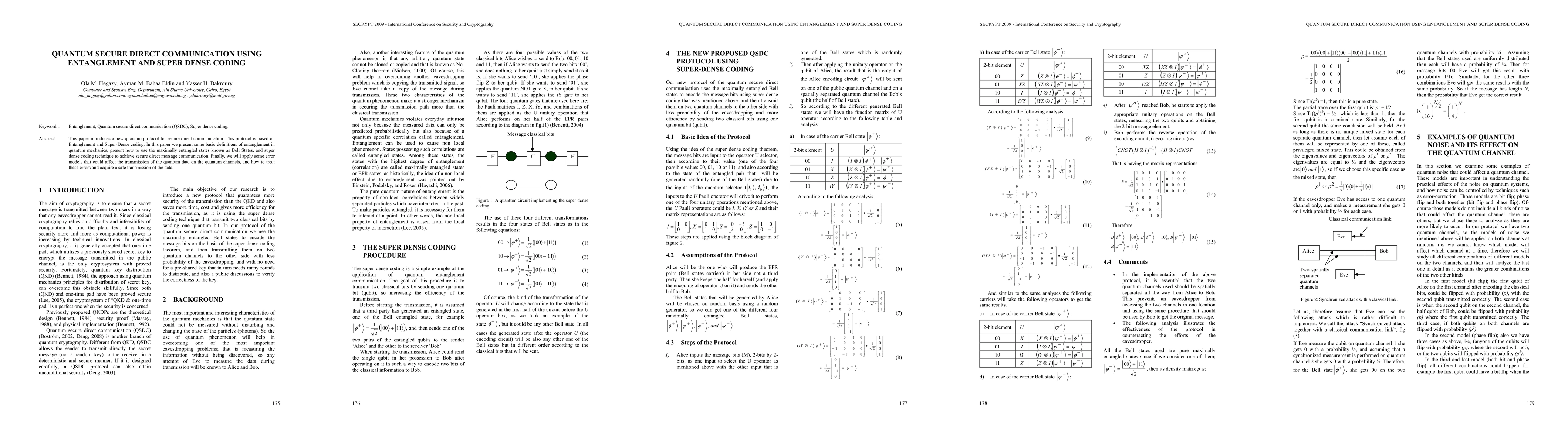 This paper introduces a new quantum protocol for secure direct communication. This protocol is based on Entanglement and Super-Dense coding. In this paper we present some basic definitions of entanglement in quantum mechanics, present how to use the maximally entangled states known as Bell States, and super dense coding technique to achieve secure direct message communication. Finally, we will apply some error models that could affect the transmission of the quantum data on the quantum channels, and how to treat these errors and acquire a safe transmission of the data.