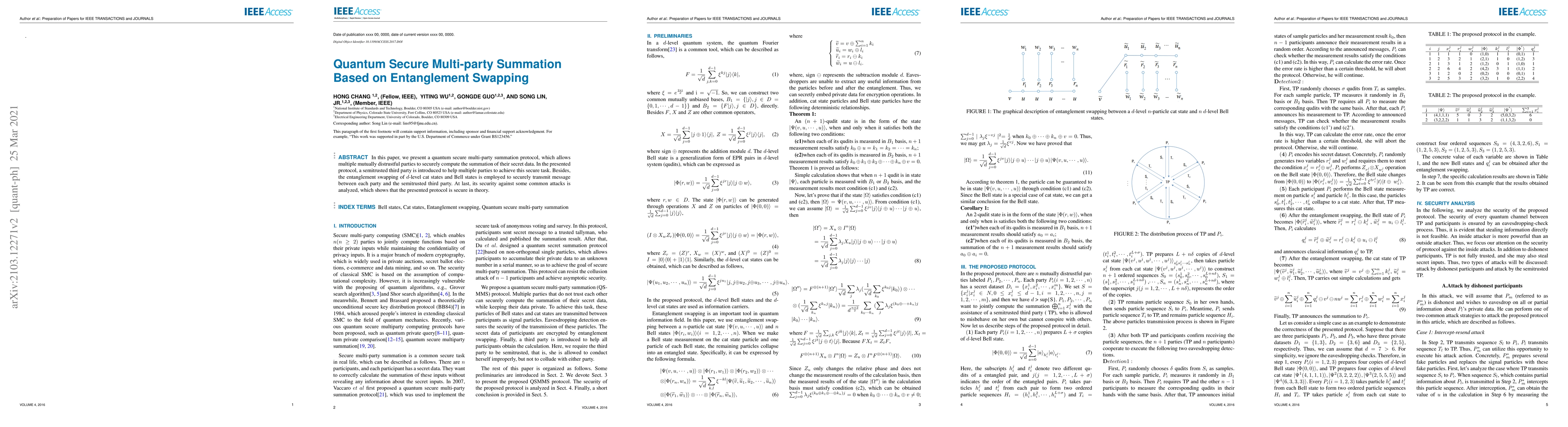 This paper proposes a quantum secure multi-party summation protocol using entanglement swapping of $d$-level cat states and Bell states, with a semitrusted third party facilitating secure computation among distrustful parties. The protocol's security against common attacks is theoretically analyzed and confirmed.