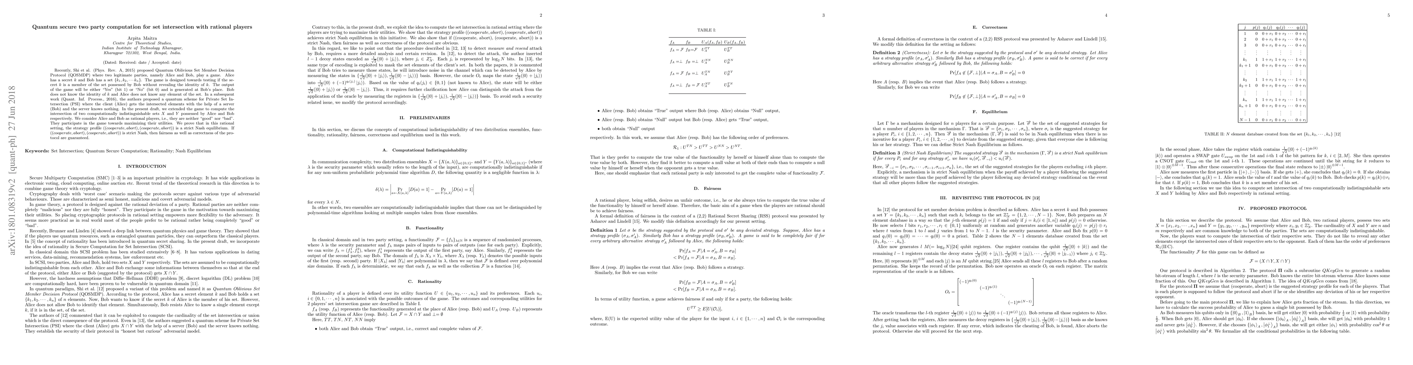 Recently, Shi et al. (Phys. Rev. A, 2015) proposed Quantum Oblivious Set Member Decision Protocol (QOSMDP) where two legitimate parties, namely Alice and Bob, play a game. Alice has a secret $k$ and Bob has a set $\{k_1,k_2,\cdots k_n\}$. The game is designed towards testing if the secret $k$ is a member of the set possessed by Bob without revealing the identity of $k$. The output of the game will be either "Yes" (bit $1$) or "No" (bit $0$) and is generated at Bob's place. Bob does not know the identity of $k$ and Alice does not know any element of the set. In a subsequent work (Quant. Inf. Process., 2016), the authors proposed a quantum scheme for Private Set Intersection (PSI) where the client (Alice) gets the intersected elements with the help of a server (Bob) and the server knows nothing. In the present draft, we extended the game to compute the intersection of two computationally indistinguishable sets $X$ and $Y$ possessed by Alice and Bob respectively. We consider Alice and Bob as rational players, i.e., they are neither "good" nor "bad". They participate in the game towards maximizing their utilities. We prove that in this rational setting, the strategy profile $((cooperate, abort), (cooperate, abort)$) is a strict Nash equilibrium. If $((cooperate, abort), (cooperate, abort)$) is strict Nash, then fairness as well as correctness of the protocol are guaranteed.
