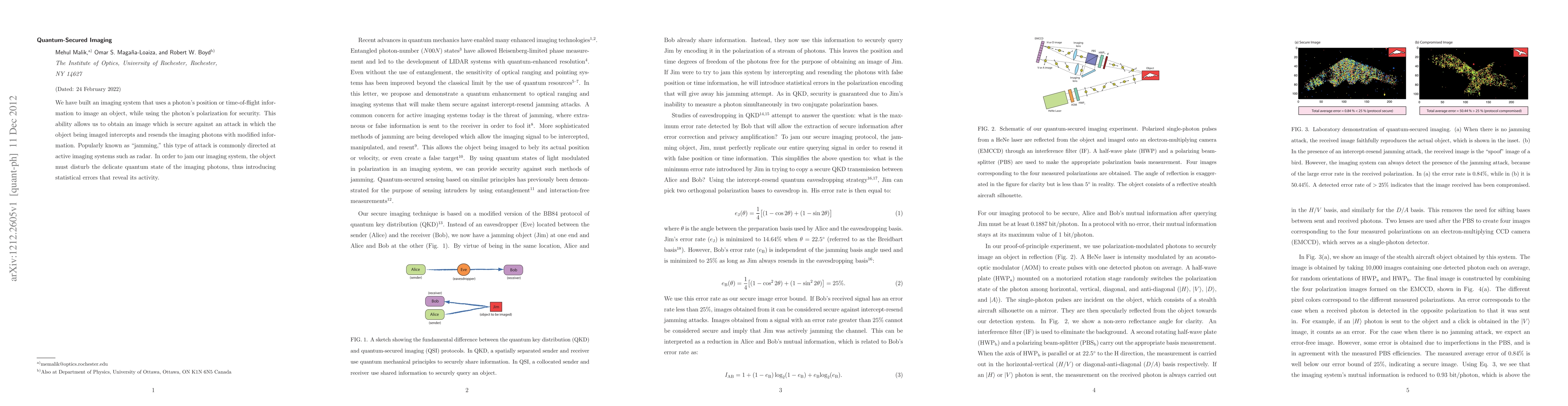 We have built an imaging system that uses a photon's position or time-of-flight information to image an object, while using the photon's polarization for security. This ability allows us to obtain an image which is secure against an attack in which the object being imaged intercepts and resends the imaging photons with modified information. Popularly known as "jamming," this type of attack is commonly directed at active imaging systems such as radar. In order to jam our imaging system, the object must disturb the delicate quantum state of the imaging photons, thus introducing statistical errors that reveal its activity.
