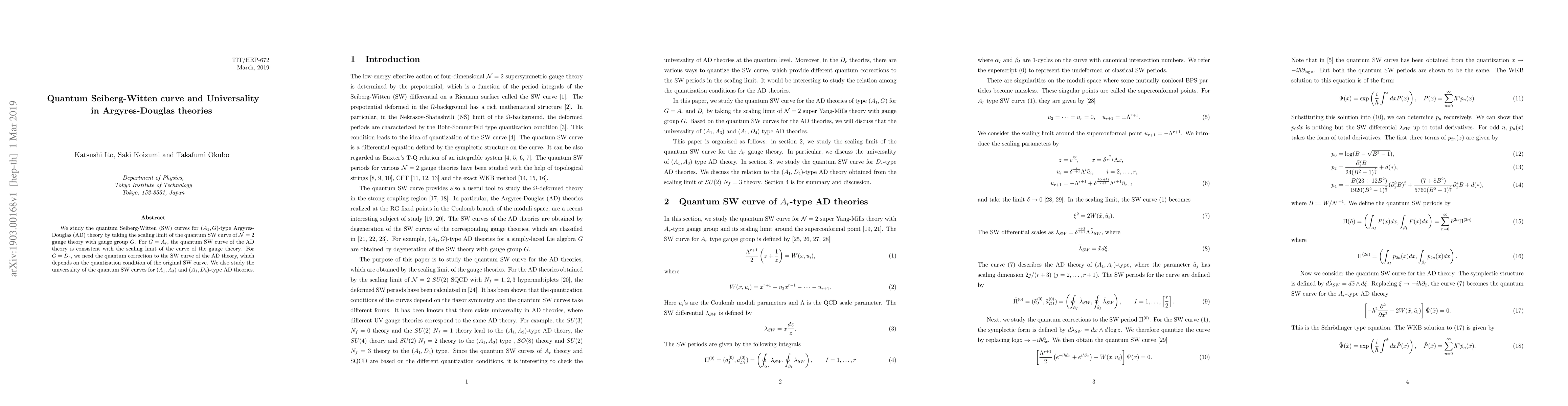 This paper investigates the quantum Seiberg-Witten curves for $(A_1, G)$-type Argyres-Douglas theories, showing that for $G=A_r$, the AD theory's curve aligns with the gauge theory's scaling limit. For $G=D_r$, a quantum correction is required, and it explores the universality of these curves in $(A_1, A_3)$ and $(A_1, D_4)$ AD theories.