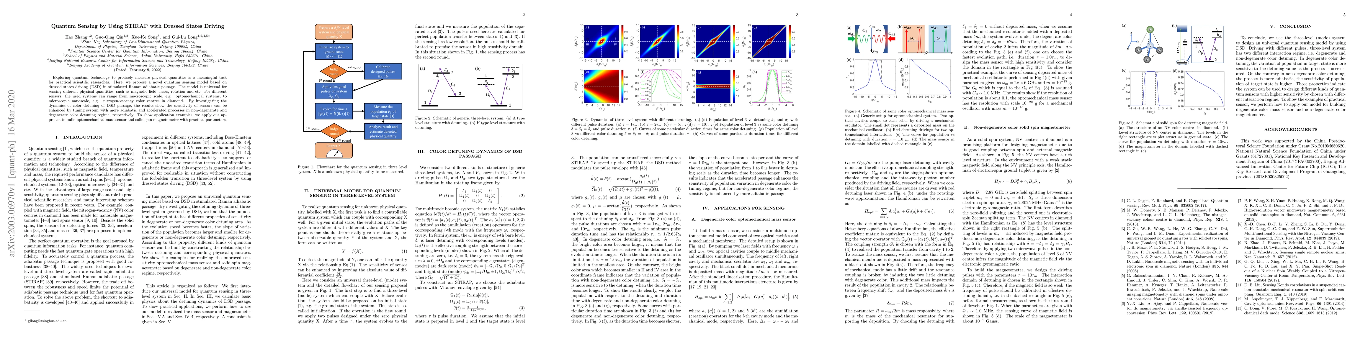 Exploring quantum technology to precisely measure physical quantities is a meaningful task for practical scientific researches. Here, we propose a novel quantum sensing model based on dressed states driving (DSD) in stimulated Raman adiabatic passage. The model is universal for sensing different physical quantities, such as magnetic field, mass, rotation and etc. For different sensors, the used systems can range from macroscopic scale, e.g. optomechanical systems, to microscopic nanoscale, e.g. nitrogen-vacancy color centres in diamond. By investigating the dynamics of color detuning of DSD passage, the results show the sensitivity of sensors can be enhanced by tuning system with more adiabatic and accelerated processes in non-degenerate and degenerate color detuning regime, respectively. To show application examples, we apply our approach to build optomechanical mass sensor and solid spin magnetometer with practical parameters.
