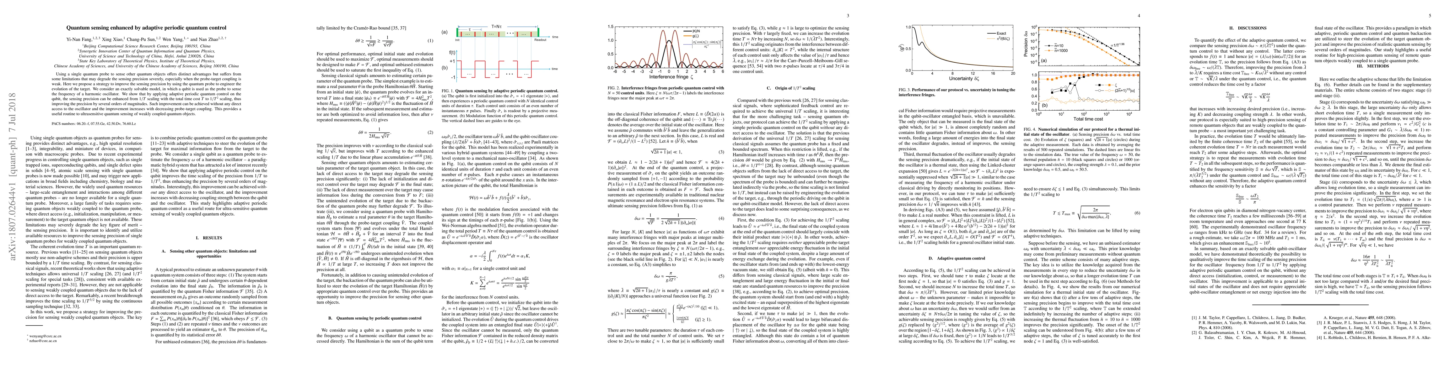 This paper proposes a method to enhance quantum sensing precision using adaptive periodic quantum control on a qubit probe to engineer the evolution of a target harmonic oscillator. The technique improves sensing precision from 1/T scaling to 1/T^2 scaling, significantly boosting accuracy, especially for weakly coupled systems.