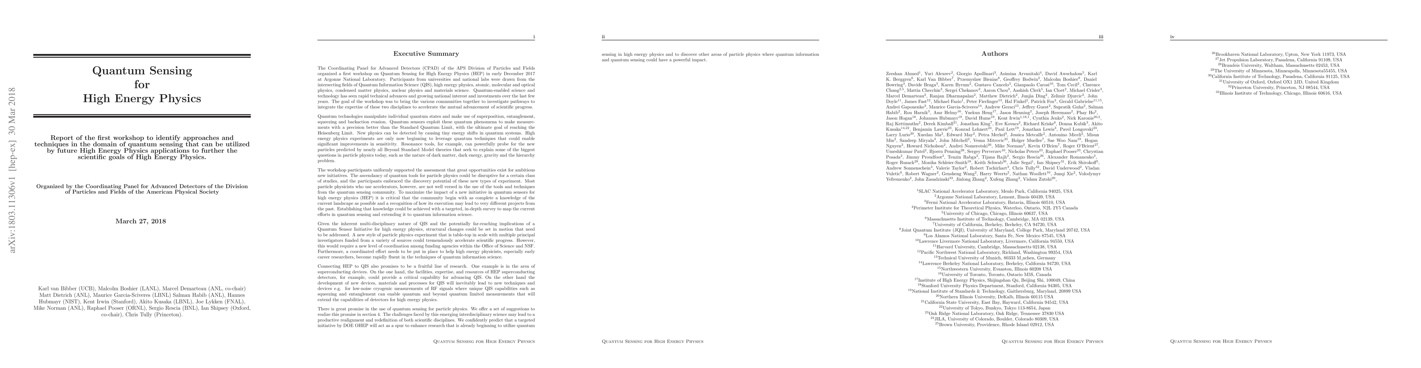 Report of the first workshop to identify approaches and techniques in the domain of quantum sensing that can be utilized by future High Energy Physics applications to further the scientific goals of High Energy Physics.