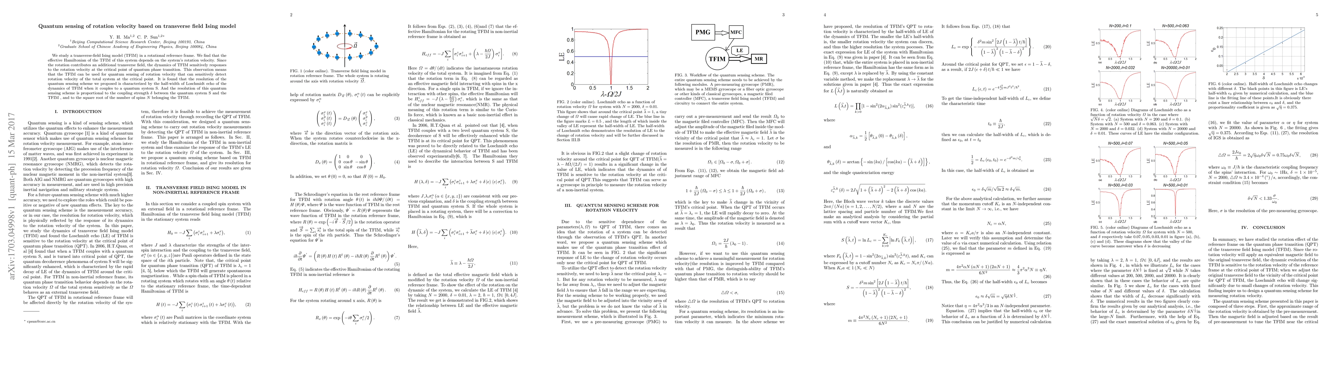 This paper explores the use of a transverse-field Ising model (TFIM) in a rotating reference frame for quantum sensing of rotation velocity. The study finds that the system's rotation velocity affects the TFIM's effective Hamiltonian, especially at the quantum phase transition critical point, enabling sensitive detection of rotation velocity. The proposed sensing scheme's resolution is linked to the coupling strength and the number of spins in the TFIM.