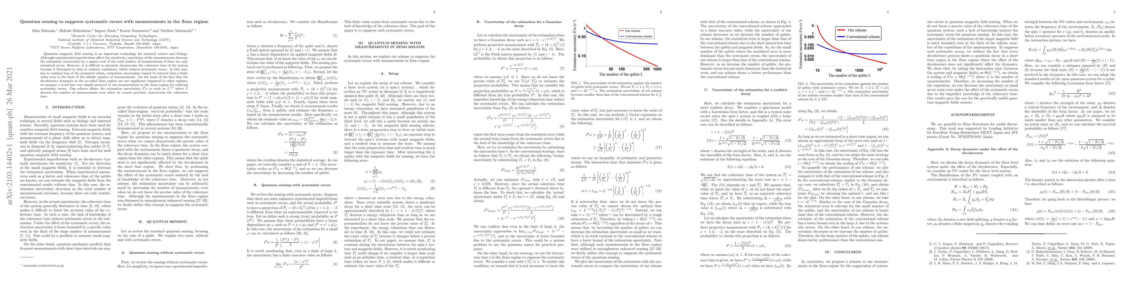 Quantum magnetic field sensing is an important technology for material science and biology. Although experimental imperfections affect the sensitivity, repetitions of the measurements decrease the estimation uncertainty by a square root of the total number of the measurements if there are only statistical errors. However, it is difficult to precisely characterize the coherence time of the system because it fluctuates in time in realistic conditions, which induces systematic errors. In this case, due to residual bias of the measured values, estimation uncertainty cannot be lowered than a finite value even in the limit of the infinite number of measurements. On the basis of the fact that the decoherence dynamics in the so-called Zeno regime are not significant compared to other regimes, we propose a novel but very simple protocol to use measurements in the Zeno regime for reducing systematic errors. Our scheme allows the estimation uncertainty $\delta ^2 \omega$ to scale as $L^{1/4}$ where $L$ denotes the number of the measurements even when we cannot precisely characterize the coherence time.