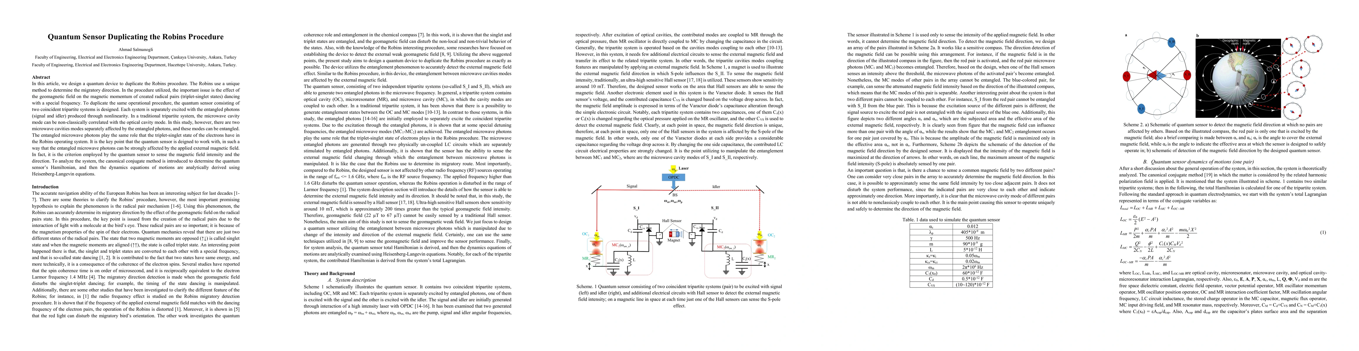In this article, we design a quantum device to duplicate the Robins procedure. The Robins use a unique method to determine the migratory direction. In the procedure utilized, the important issue is the effect of the geomagnetic field on the magnetic momentum of created radical pairs (triplet-singlet states) dancing with a special frequency. To duplicate the same operational procedure, the quantum sensor consisting of two coincident tripartite systems is designed. Each system is separately excited with the entangled photons (signal and idler) produced through nonlinearity. In a traditional tripartite system, the microwave cavity mode can be non-classically correlated with the optical cavity mode. In this study, however, there are two microwave cavities modes separately affected by the entangled photons, and these modes can be entangled. The entangled microwave photons play the same role that the triplet-singlet state of the electrons have in the Robins operating system. It is the key point that the quantum sensor is deigned to work with, in such a way that the entangled microwave photons can be strongly affected by the applied external magnetic field. In fact, it is the criterion employed by the quantum sensor to sense the magnetic field intensity and the direction. To analyze the system, the canonical conjugate method is introduced to determine the quantum sensor Hamiltonian, and then the dynamics equations of motions are analytically derived using Heisenberg-Langevin equations.