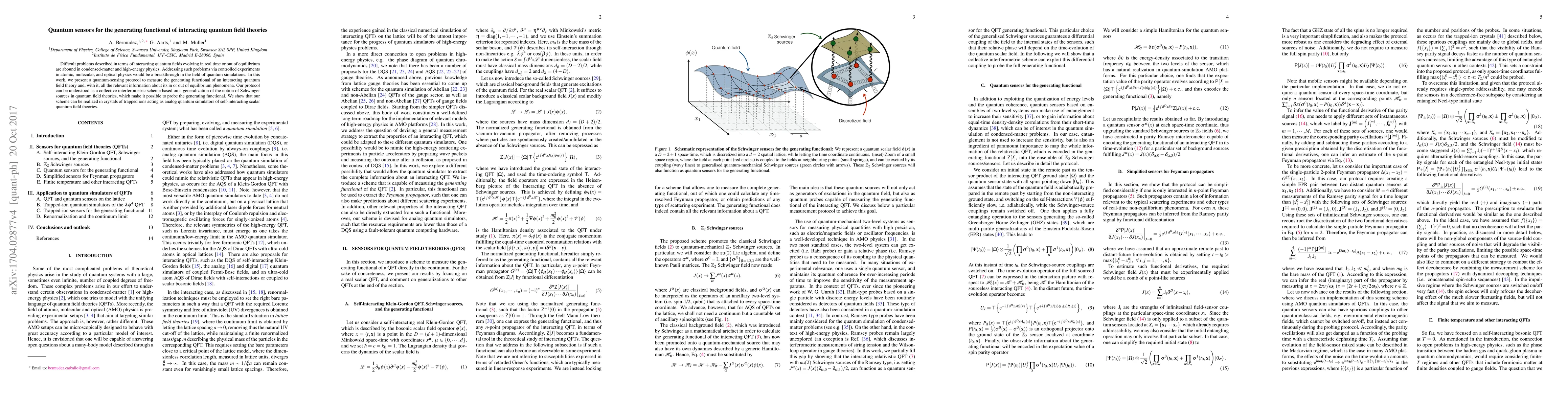 Difficult problems described in terms of interacting quantum fields evolving in real time or out of equilibrium are abound in condensed-matter and high-energy physics. Addressing such problems via controlled experiments in atomic, molecular, and optical physics would be a breakthrough in the field of quantum simulations. In this work, we present a quantum-sensing protocol to measure the generating functional of an interacting quantum field theory and, with it, all the relevant information about its in or out of equilibrium phenomena. Our protocol can be understood as a collective interferometric scheme based on a generalization of the notion of Schwinger sources in quantum field theories, which make it possible to probe the generating functional. We show that our scheme can be realized in crystals of trapped ions acting as analog quantum simulators of self-interacting scalar quantum field theories.