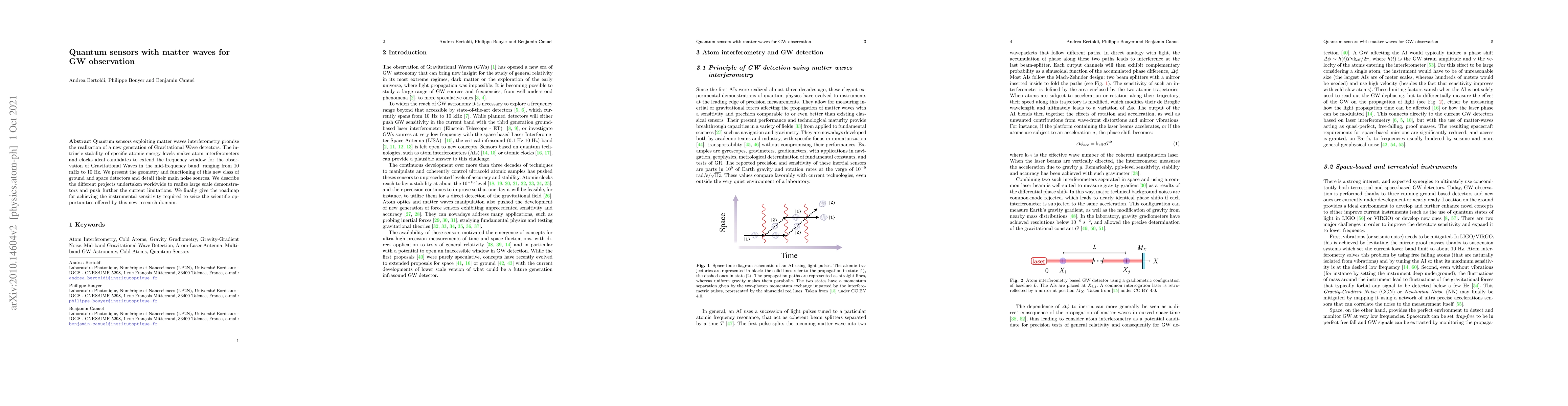 Quantum sensors exploiting matter waves interferometry promise to realize a new generation of Gravitational Wave detectors. The intrinsic stability of specific atomic energy levels makes atom interferometers and clocks ideal candidates to extend the frequency window for the observation of Gravitational Waves in the mid-frequency band, ranging from 10 mHz to 10 Hz. We present the geometry and functioning of this new class of ground and space detectors and detail their main noise sources. We describe the different projects undertaken worldwide to realize large scale demonstrators and push further the current limitations. We finally give the roadmap for achieving the instrumental sensitivity required to seize the scientific opportunities offered by this new research domain.