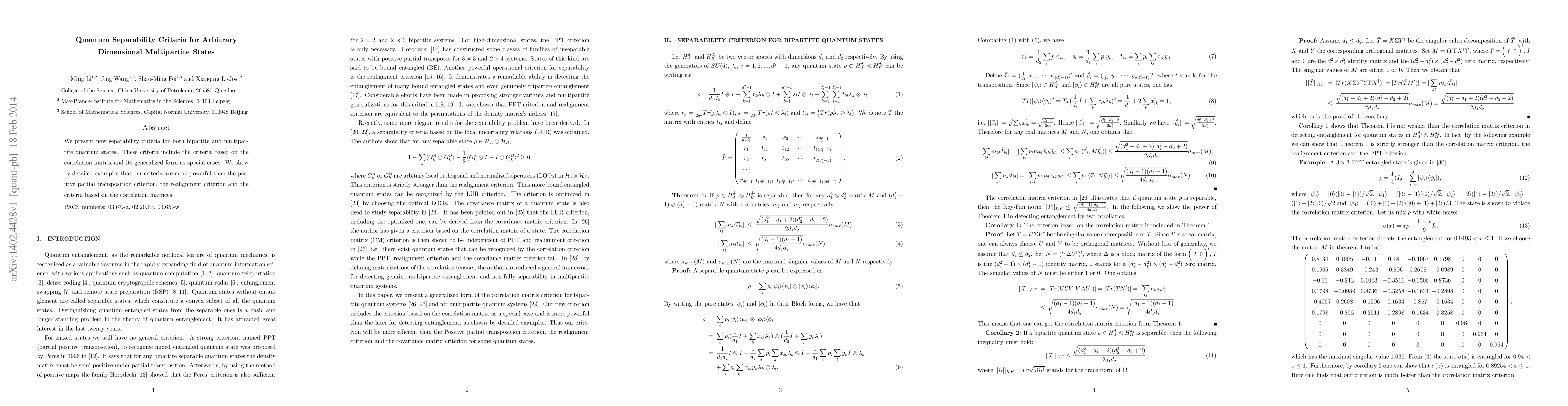 Summary: This paper introduces new separability criteria for quantum states, including both bipartite and multipartite cases, based on correlation matrices. The proposed criteria are demonstrated to be more effective than existing methods like the positive partial transposition and realignment criteria.