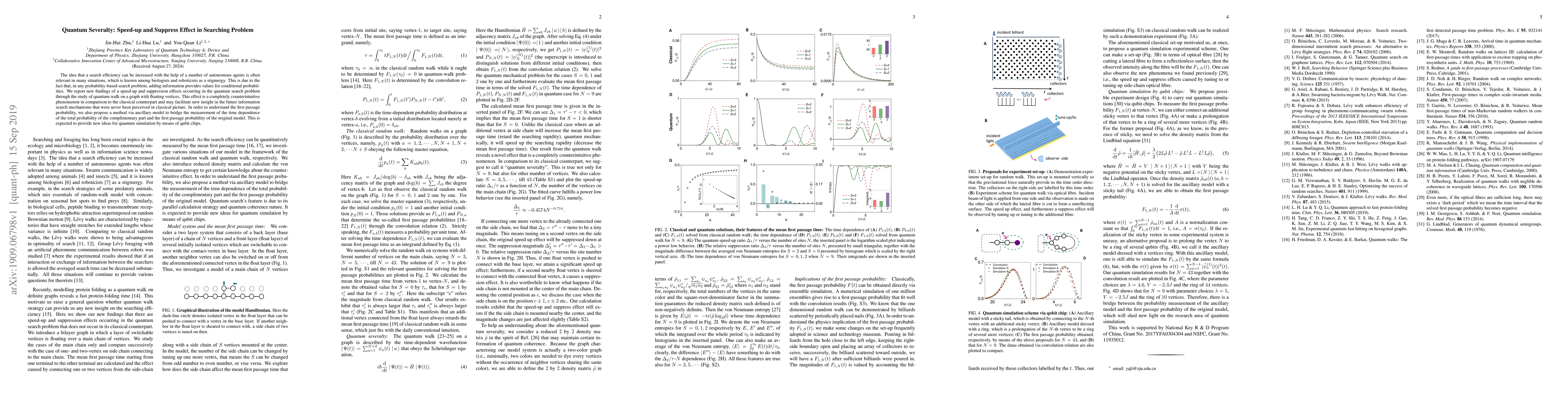 This paper investigates quantum search efficiency through quantum walks on graphs with floating vertices, revealing counterintuitive speed-up and suppression effects that differ from classical search methods. It proposes an ancillary model to measure first passage probabilities, potentially offering new insights for quantum information search and simulation.