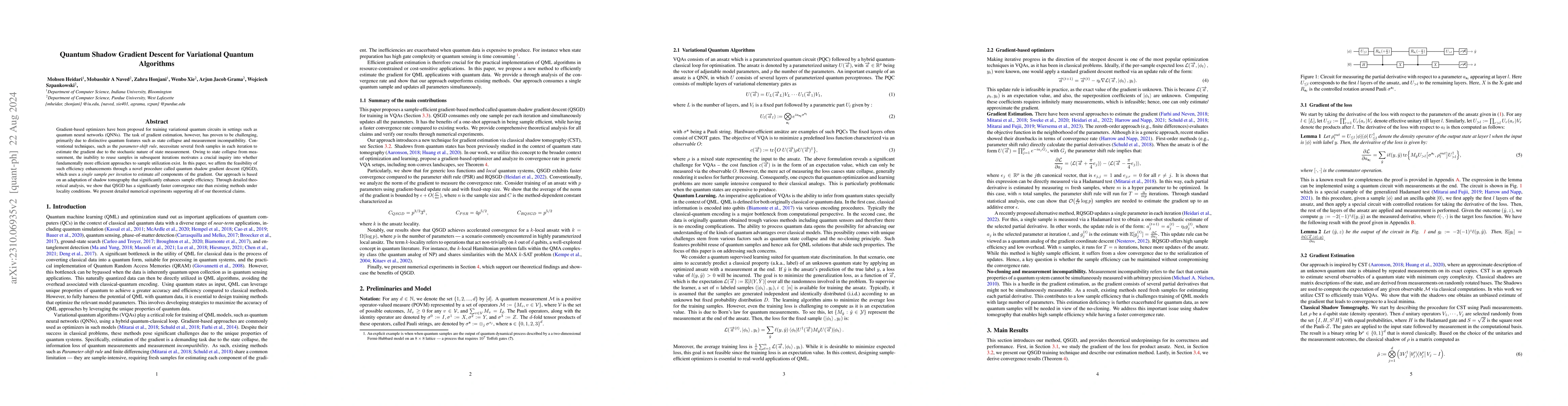 This paper proposes a new procedure called quantum shadow gradient descent (QSGD) that addresses these key challenges. Our method has the benefits of a one-shot approach, in not requiring any sample duplication while having a convergence rate comparable to the ideal update rule using exact gradient computation. We propose a new technique for generating quantum shadow samples (QSS), which generates quantum shadows as opposed to classical shadows used in existing works. With classical shadows, the computations are typically performed on classical computers and, hence, are prohibitive since the dimension grows exponentially. Our approach resolves this issue by measurements of quantum shadows. As the second main contribution, we study more general non-product ansatz of the form $\exp\{i\sum_j \theta_j A_j\}$ that model variational Hamiltonians. We prove that the gradient can be written in terms of the gradient of single-parameter ansatzes that can be easily measured. Our proof is based on the Suzuki-Trotter approximation; however, our expressions are exact, unlike prior efforts that approximate non-product operators. As a result, existing gradient measurement techniques can be applied to more general VQAs followed by correction terms without any approximation penalty. We provide theoretical proofs, convergence analysis and verify our results through numerical experiments.