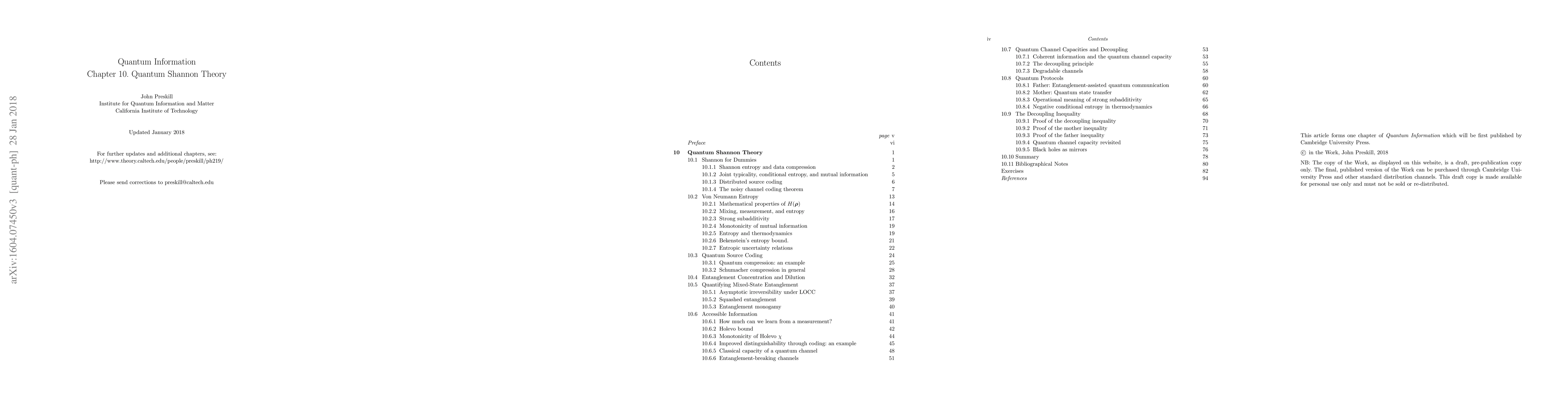 This is the 10th and final chapter of my book on Quantum Information, based on the course I have been teaching at Caltech since 1997. An earlier version of this chapter (originally Chapter 5) has been available on the course website since 1998, but this version is substantially revised and expanded. Topics covered include classical Shannon theory, quantum compression, quantifying entanglement, accessible information, and using the decoupling principle to derive achievable rates for quantum protocols. This is a draft, pre-publication copy of Chapter 10, which I will continue to update. See the URL on the title page for further updates and drafts of other chapters, and please send me an email if you notice errors.