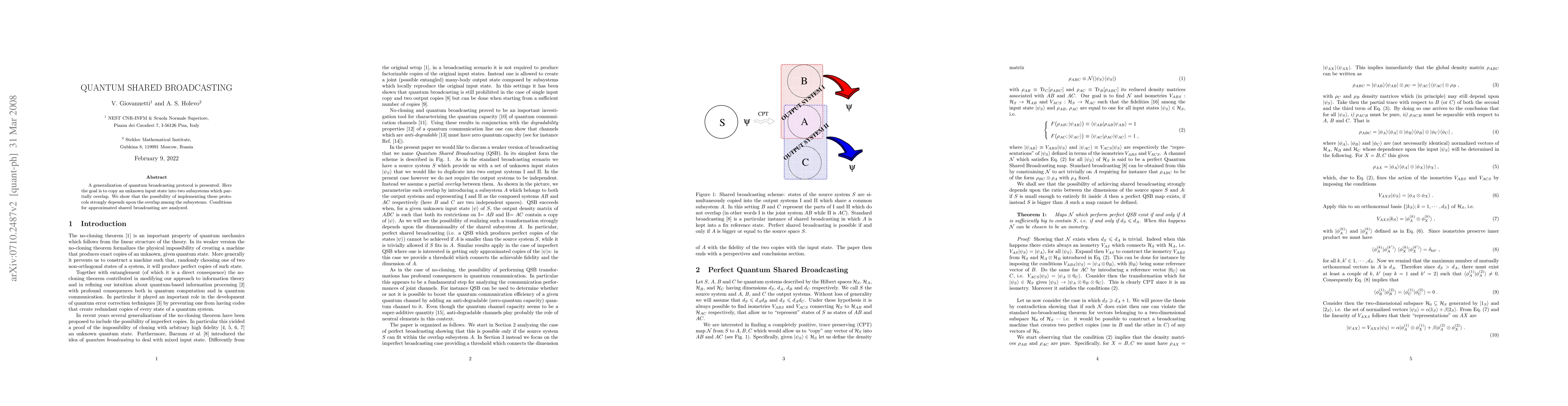 Summary: This paper generalizes quantum broadcasting protocols to allow copying an unknown input state into two partially overlapping subsystems, demonstrating that the feasibility of such protocols hinges on the degree of overlap. The study also analyzes conditions for achieving approximate shared broadcasting.