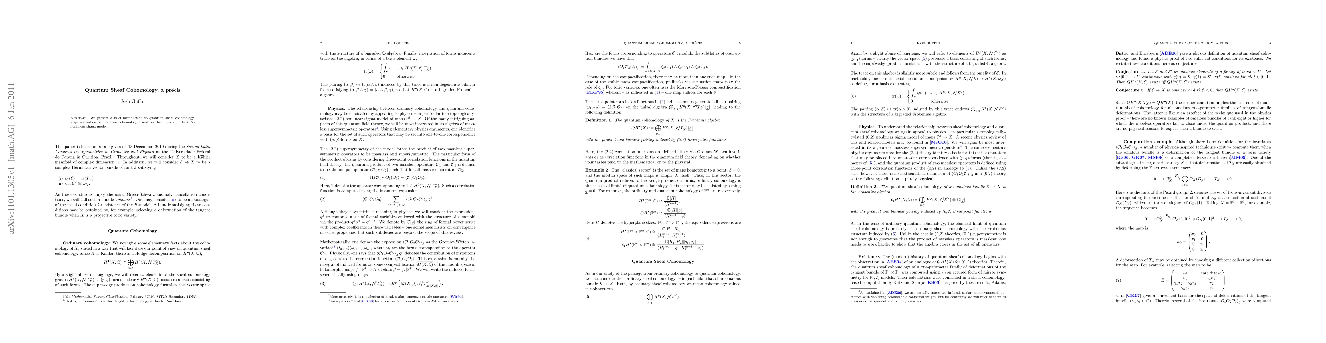 Summary: This paper introduces quantum sheaf cohomology, expanding on quantum cohomology concepts through the framework of (0,2) nonlinear sigma model physics. It aims to generalize existing quantum cohomology techniques.