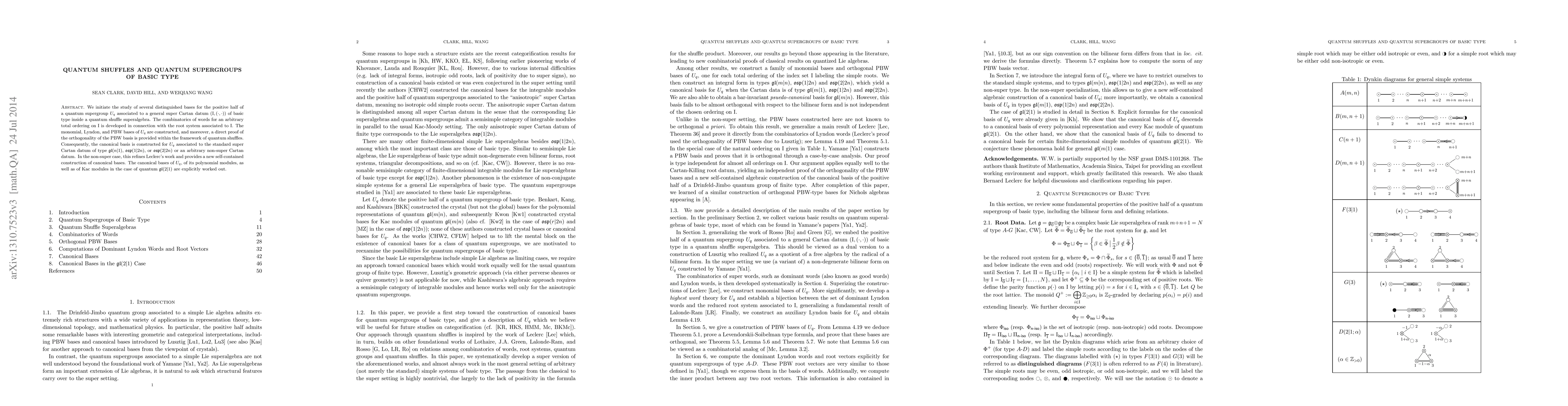 We initiate the study of several distinguished bases for the positive half of a quantum supergroup $U_q$ associated to a general super Cartan datum $(\mathrm{I}, (\cdot,\cdot))$ of basic type inside a quantum shuffle superalgebra. The combinatorics of words for an arbitrary total ordering on $\mathrm{I}$ is developed in connection with the root system associated to $\mathrm{I}$. The monomial, Lyndon, and PBW bases of $U_q$ are constructed, and moreover, a direct proof of the orthogonality of the PBW basis is provided within the framework of quantum shuffles. Consequently, the canonical basis is constructed for $U_q$ associated to the standard super Cartan datum of type $\mathfrak{gl}(n|1)$, $\mathfrak{osp}(1|2n)$, or $\mathfrak{osp}(2|2n)$ or an arbitrary non-super Cartan datum. In the non-super case, this refines Leclerc's work and provides a new self-contained construction of canonical bases. The canonical bases of $U_q$, of its polynomial modules, as well as of Kac modules in the case of quantum $\mathfrak{gl}(2|1)$ are explicitly worked out.