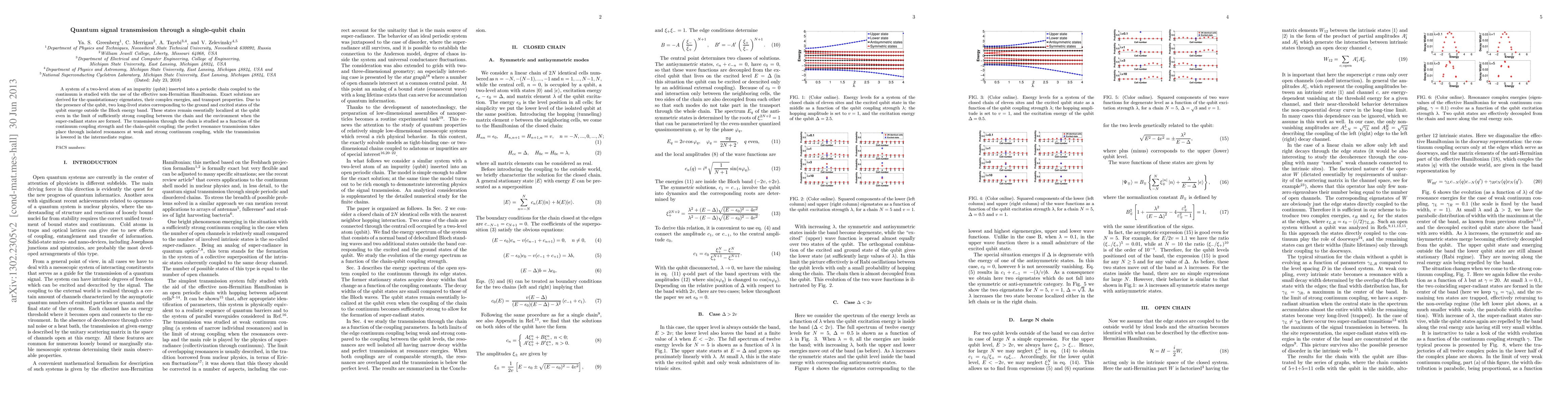 The paper presents a detailed analysis of quantum signal transmission through a single-qubit chain using an effective non-Hermitian Hamiltonian, deriving exact solutions for quasistationary eigenstates, complex energies, and transport properties.