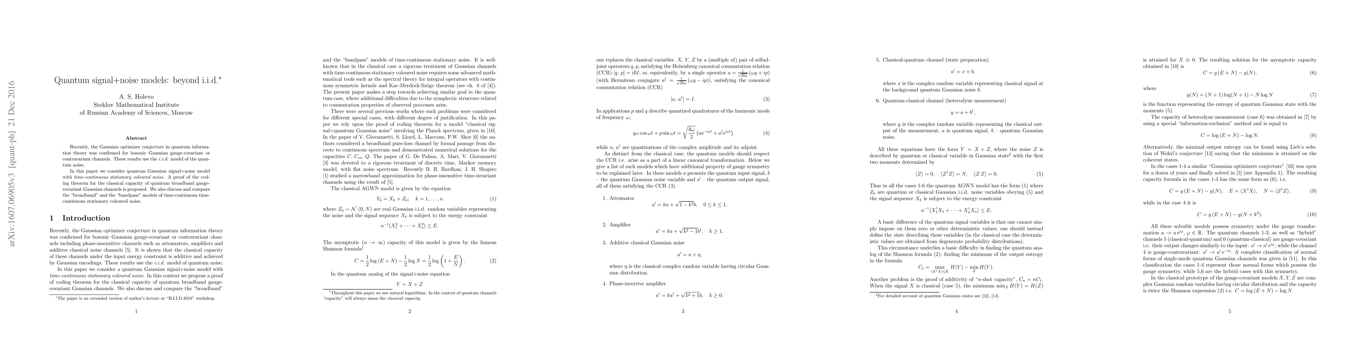 Recently, the Gaussian optimizer conjecture in quantum information theory was confirmed for bosonic Gaussian gauge-covariant or contravariant channels. These results use the i.i.d. model of the quantum noise. In this paper we consider quantum Gaussian signal+noise model with time-continuous stationary coloured noise. A proof of the coding theorem for the classical capacity of quantum broadband gauge-covariant Gaussian channels is given. We also discuss and compare the "broadband" and the "bandpass" models of time-continuous time-continuous stationary coloured noise.