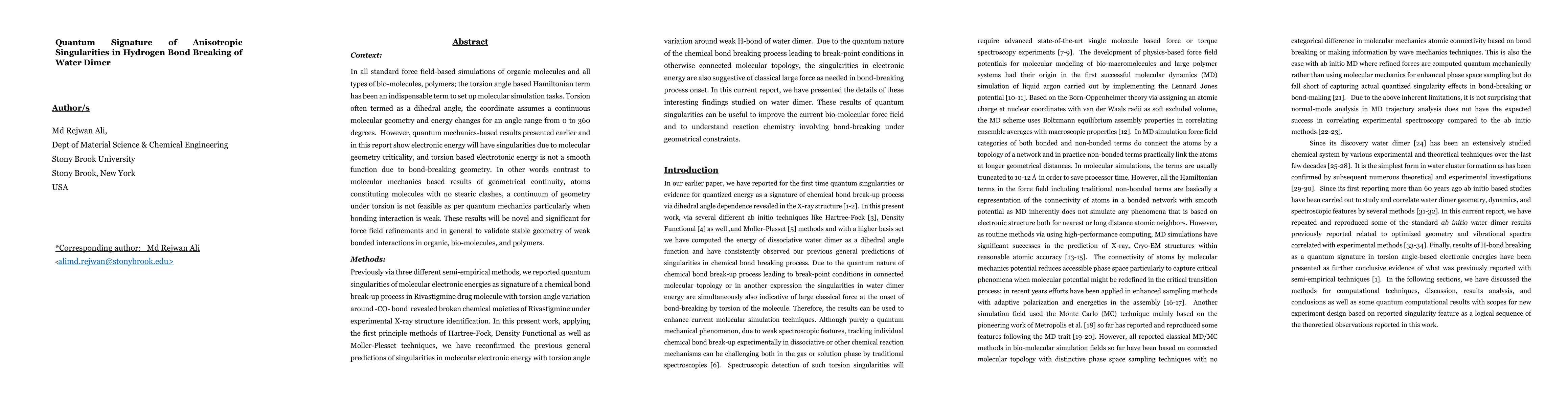 The paper presents a quantum mechanical analysis of electronic energy singularities in water dimer torsion angles, contrasting with classical force field-based simulations.