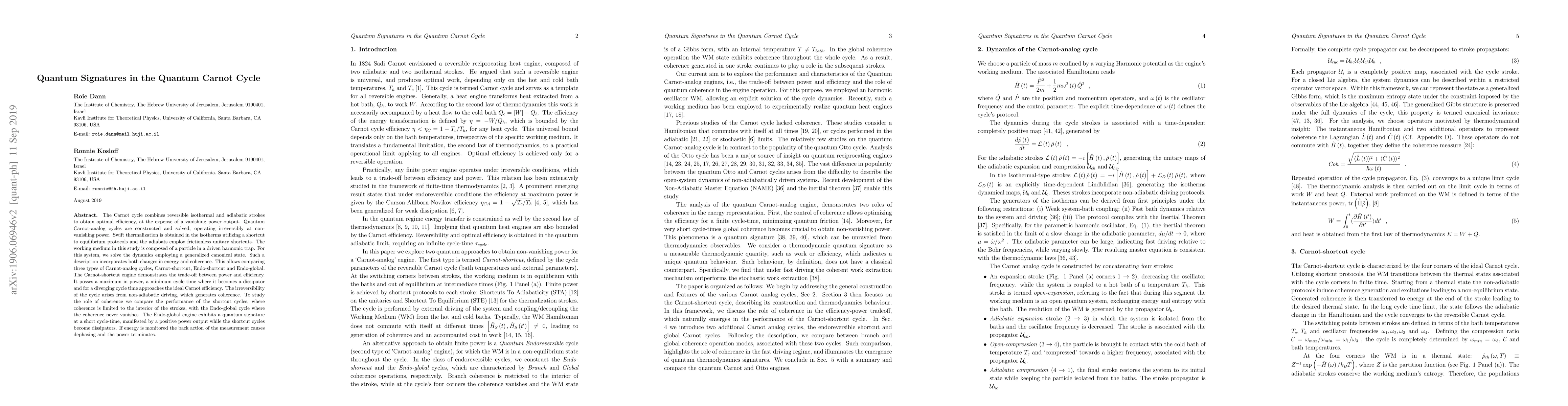The Carnot cycle combines reversible isothermal and adiabatic strokes to obtain optimal efficiency, at the expense of a vanishing power output. Quantum Carnot-analog cycles are constructed and solved, operating irreversibly at non-vanishing power. Swift thermalization is obtained in the isotherms utilizing a shortcut to equilibrium protocols and the adiabats employ frictionless unitary shortcuts. The working medium in this study is composed of a particle in a driven harmonic trap. For this system, we solve the dynamics employing a generalized canonical state. Such a description incorporates both changes in energy and coherence. This allows comparing three types of Carnot-analog cycles, Carnot-shortcut, Endo-shortcut and Endo-global. The Carnot-shortcut engine demonstrates the trade-off between power and efficiency. It posses a maximum in power, a minimum cycle time where it becomes a dissipator and for a diverging cycle time approaches the ideal Carnot efficiency. The irreversibility of the cycle arises from non-adiabatic driving, which generates coherence. To study the role of coherence we compare the performance of the shortcut cycles, where coherence is limited to the interior of the strokes, with the Endo-global cycle where the coherence never vanishes. The Endo-global engine exhibits a quantum signature at a short cycle-time, manifested by a positive power output while the shortcut cycles become dissipators. If energy is monitored the back action of the measurement causes dephasing and the power terminates.