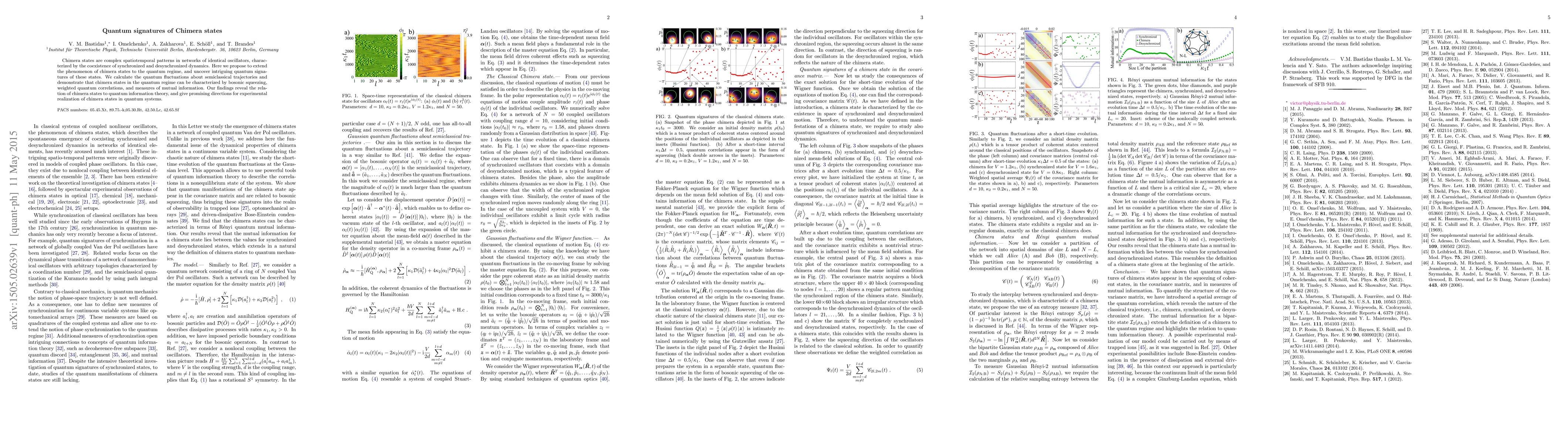 This paper explores the extension of chimera states—complex patterns of synchronized and desynchronized dynamics—into the quantum regime, revealing quantum signatures such as bosonic squeezing, quantum correlations, and mutual information. These findings link chimera states to quantum information theory and suggest potential experimental avenues for their realization in quantum systems.