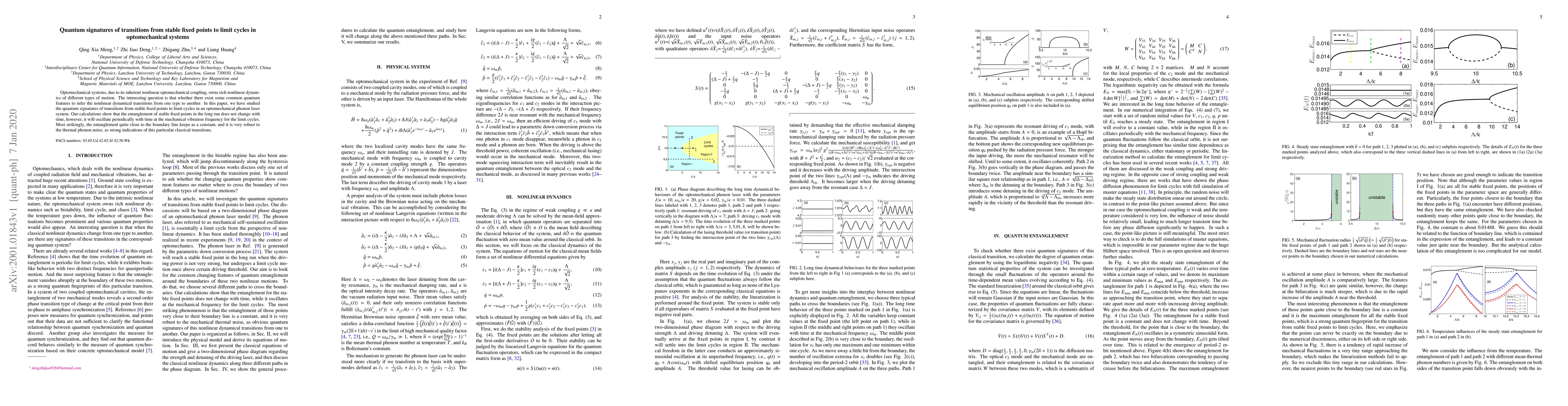 Optomechanical systems, due to its inherent nonlinear optomechanical coupling, owns rich nonlinear dynamics of different types of motion. The interesting question is that whether there exist some common quantum features to infer the nonlinear dynamical transitions from one type to another. In this paper, we have studied the quantum signatures of transitions from stable fixed points to limit cycles in an optomechanical phonon laser system. Our calculations show that the entanglement of stable fixed points in the long run does not change with time, however, it will oscillate periodically with time at the mechanical vibration frequency for the limit cycles. Most strikingly, the entanglement quite close to the boundary line keeps as a constant, and it is very robust to the thermal phonon noise, as strong indications of this particular classical transitions.