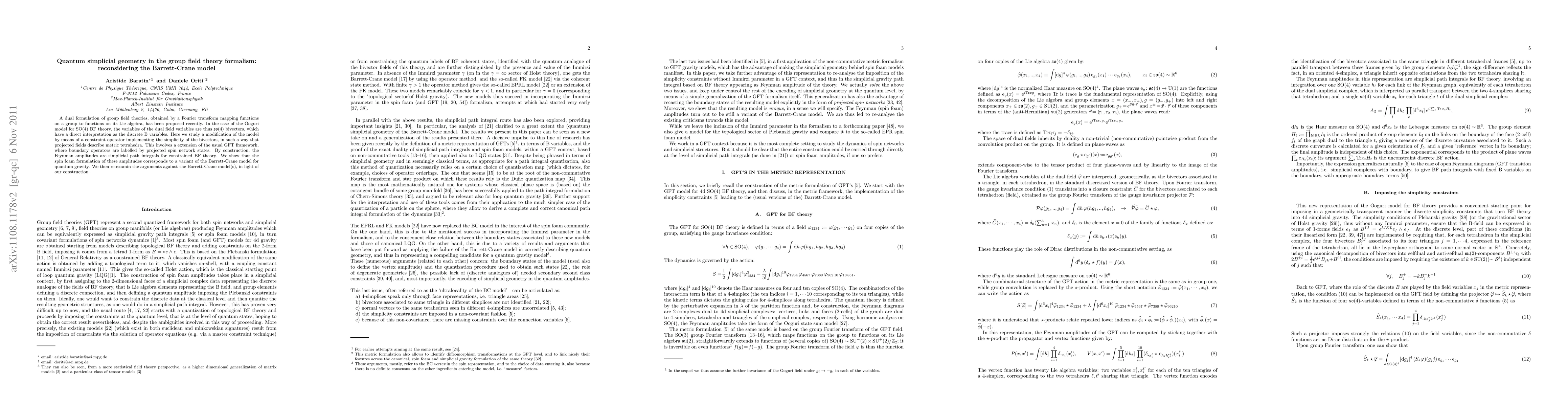 A dual formulation of group field theories, obtained by a Fourier transform mapping functions on a group to functions on its Lie algebra, has been proposed recently. In the case of the Ooguri model for SO(4) BF theory, the variables of the dual field variables are thus so(4) bivectors, which have a direct interpretation as the discrete B variables. Here we study a modification of the model by means of a constraint operator implementing the simplicity of the bivectors, in such a way that projected fields describe metric tetrahedra. This involves a extension of the usual GFT framework, where boundary operators are labelled by projected spin network states. By construction, the Feynman amplitudes are simplicial path integrals for constrained BF theory. We show that the spin foam formulation of these amplitudes corresponds to a variant of the Barrett-Crane model for quantum gravity. We then re-examin the arguments against the Barrett-Crane model(s), in light of our construction.