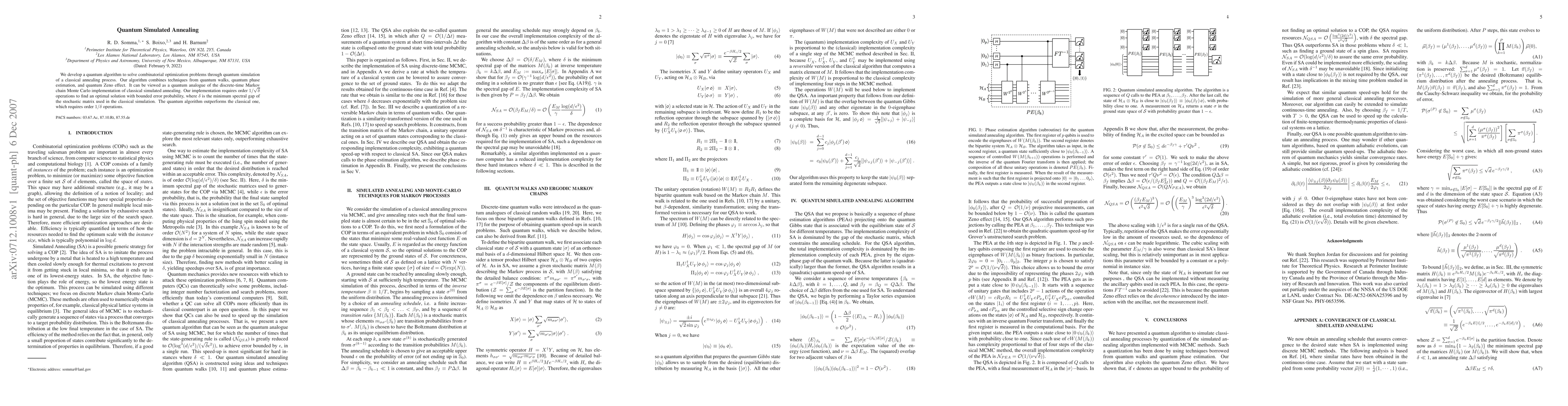 Summary: This paper introduces a quantum algorithm for solving combinatorial optimization problems using quantum simulation of classical annealing, combining quantum walks and phase estimation. It outperforms classical simulated annealing by scaling with the inverse square root of the spectral gap.