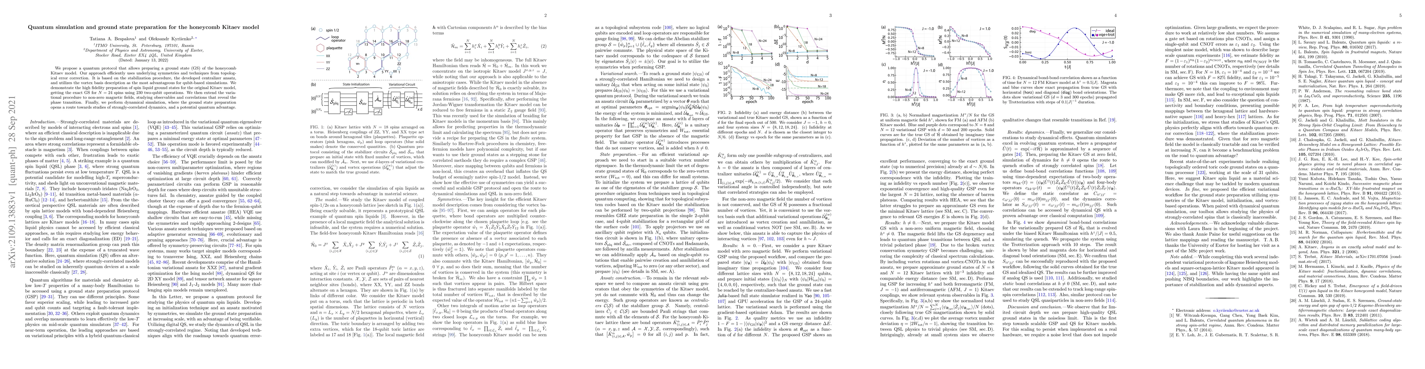 This paper proposes a quantum protocol for preparing the ground state of the honeycomb Kitaev model, leveraging symmetries and topological error correction techniques. It demonstrates high fidelity preparation using 230 two-qubit operations for N=24 spins and extends the method to study phase transitions under non-zero magnetic fields, paving the way for simulating strongly-correlated dynamics.