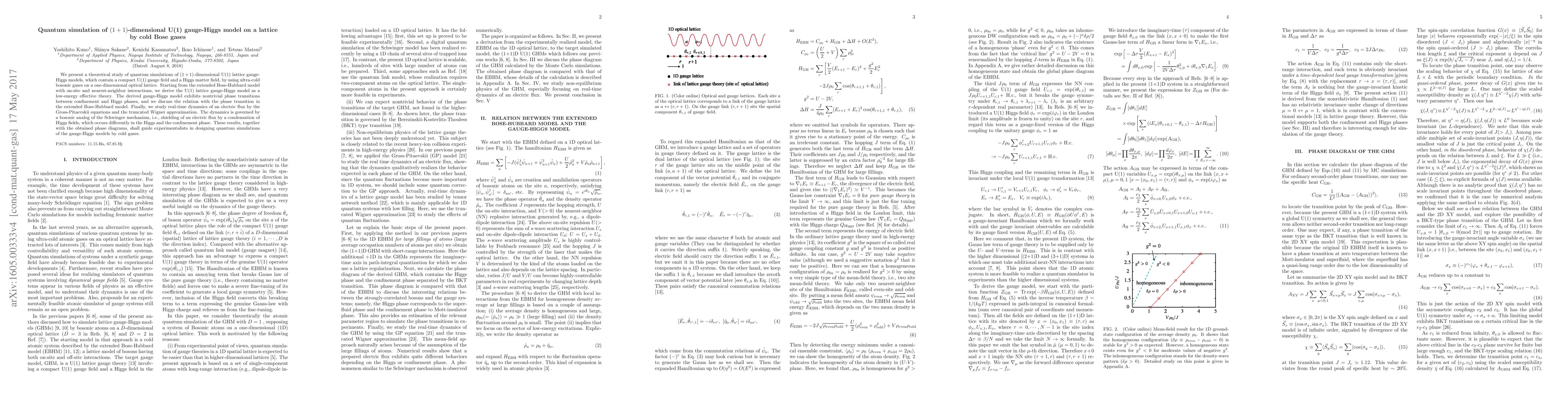 This paper presents a theoretical framework for simulating $(1+1)$-dimensional U(1) gauge-Higgs models using ultra-cold bosonic gases in a one-dimensional optical lattice, deriving the model from the extended Bose-Hubbard model and exploring its phase transitions and real-time dynamics. The study reveals distinct shielding mechanisms in different phases, aiding experimental designs for quantum simulations.