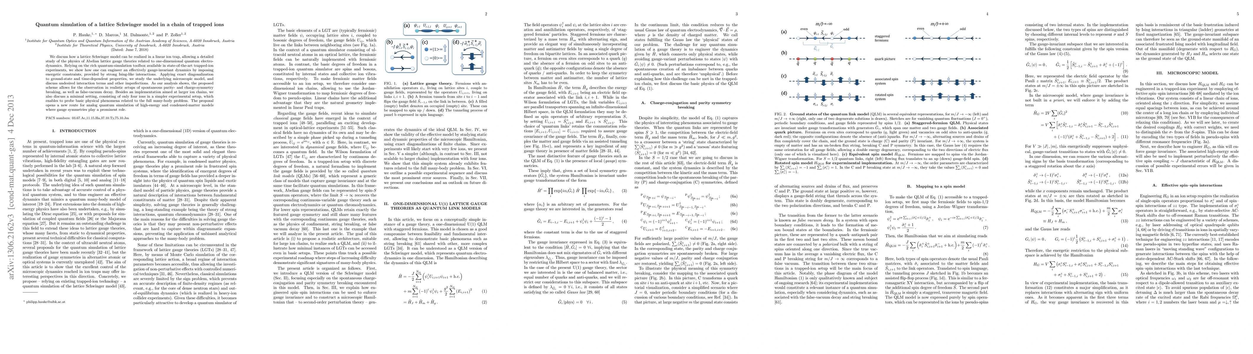 We discuss how a lattice Schwinger model can be realized in a linear ion trap, allowing a detailed study of the physics of Abelian lattice gauge theories related to one-dimensional quantum electrodynamics. Relying on the rich quantum-simulation toolbox available in state-of-the-art trapped-ion experiments, we show how one can engineer an effectively gauge-invariant dynamics by imposing energetic constraints, provided by strong Ising-like interactions. Applying exact diagonalization to ground-state and time-dependent properties, we study the underlying microscopic model, and discuss undesired interaction terms and other imperfections. As our analysis shows, the proposed scheme allows for the observation in realistic setups of spontaneous parity- and charge-symmetry breaking, as well as false-vacuum decay. Besides an implementation aimed at larger ion chains, we also discuss a minimal setting, consisting of only four ions in a simpler experimental setup, which enables to probe basic physical phenomena related to the full many-body problem. The proposal opens a new route for analog quantum simulation of high-energy and condensed-matter models where gauge symmetries play a prominent role.