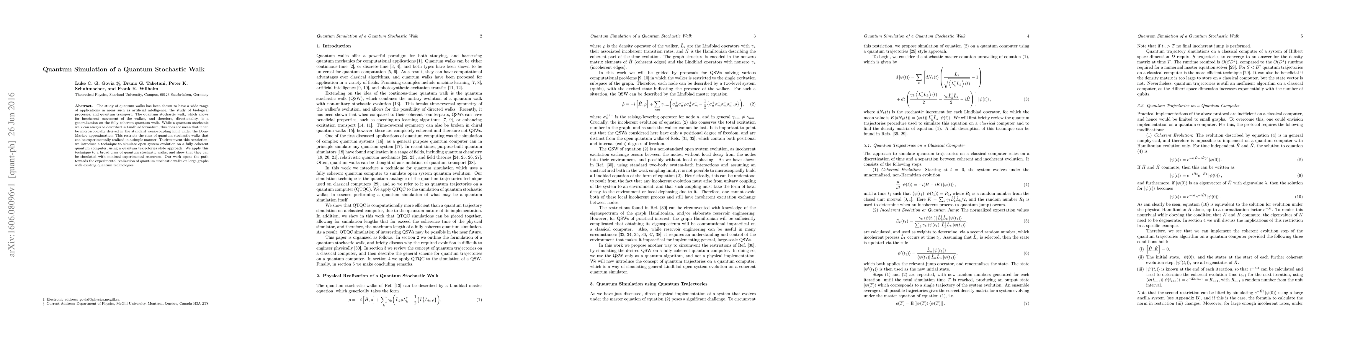 This paper introduces a method to simulate quantum stochastic walks on a fully coherent quantum computer, demonstrating that these walks can be realized with minimal resources. The technique paves the way for experimental realizations of quantum stochastic walks on large graphs using current quantum technology.