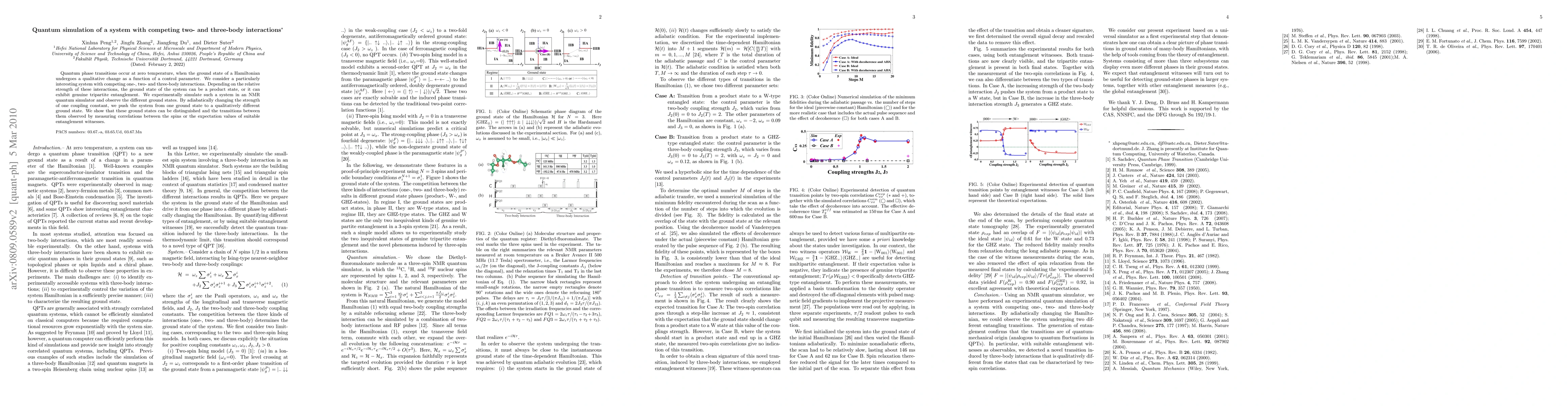 Researchers simulated a system with competing two- and three-body interactions in an NMR quantum simulator, observing different ground states that can exhibit genuine tripartite entanglement or product state behavior. The study demonstrates the ability to distinguish and measure transitions between these states by analyzing correlations and expectation values.