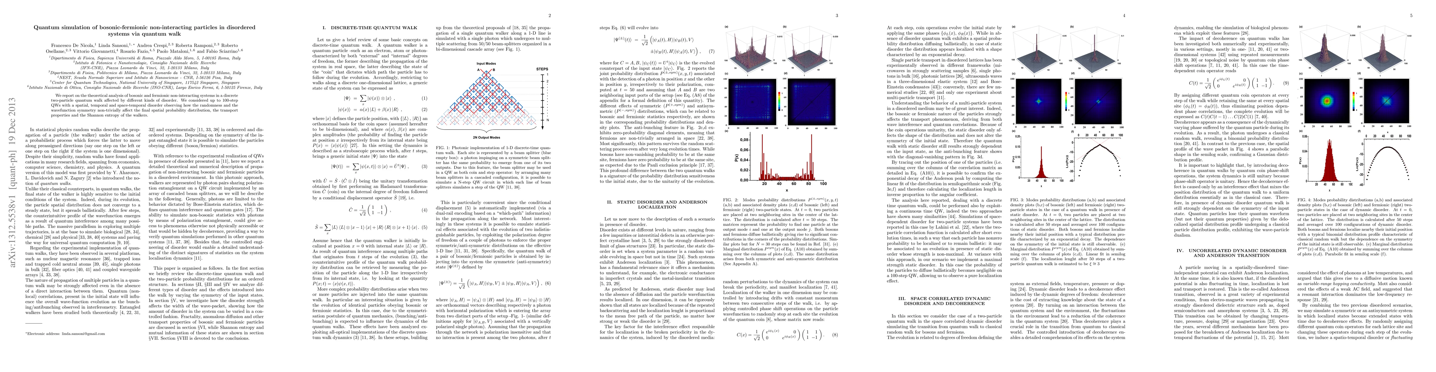 We report on the theoretical analysis of bosonic and fermionic non-interacting systems in a discrete two-particle quantum walk affected by different kinds of disorder. We considered up to 100-step QWs with a spatial, temporal and space-temporal disorder observing how the randomness and the wavefunction symmetry non-trivially affect the final spatial probability distribution, the transport properties and the Shannon entropy of the walkers.