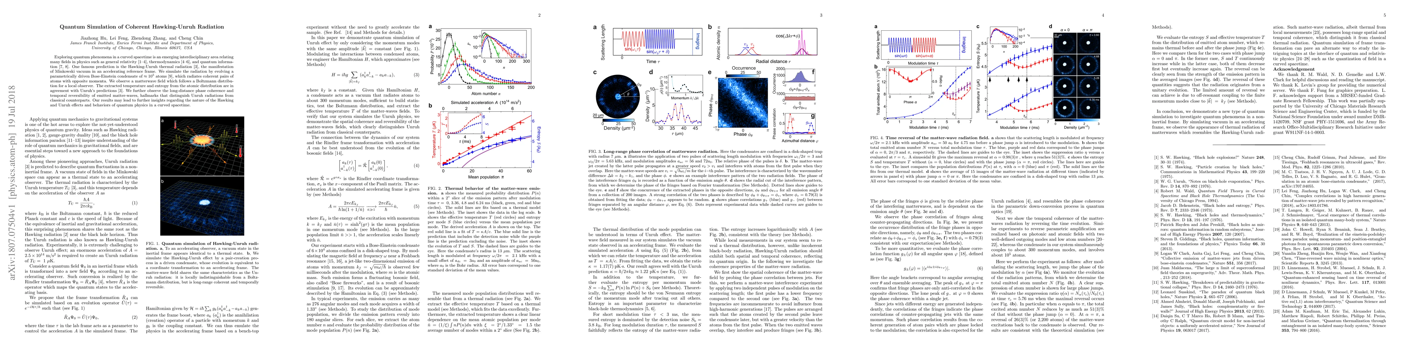 This paper presents a quantum simulation of Hawking-Unruh radiation using a parametrically driven Bose-Einstein condensate, showing coherent emission of atom pairs that follow a Boltzmann distribution and confirming theoretical predictions regarding temperature and entropy. The study highlights long-distance phase coherence and temporal reversibility, providing insights into quantum phenomena in curved spacetime.