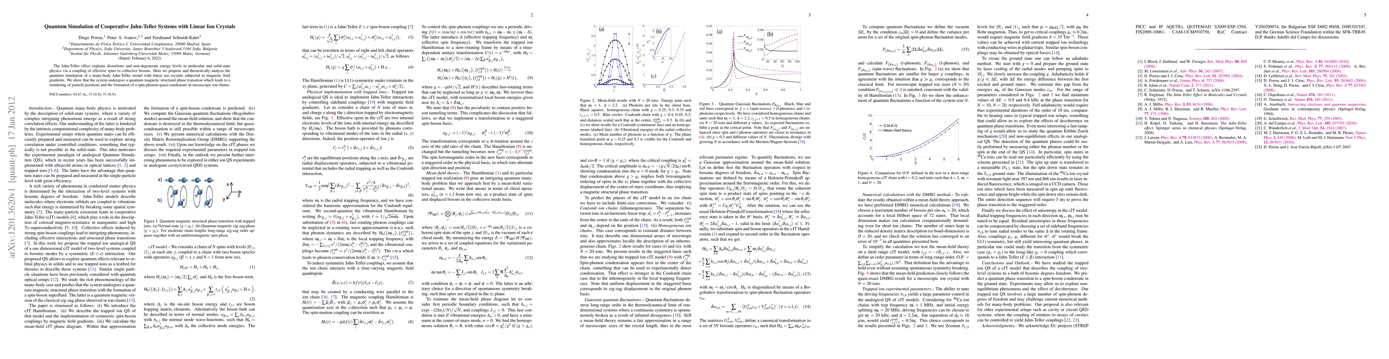 This paper proposes a quantum simulation of cooperative Jahn-Teller systems in linear ion crystals under magnetic field gradients, demonstrating a quantum magnetic structural phase transition and the emergence of a spin-phonon quasi-condensate.