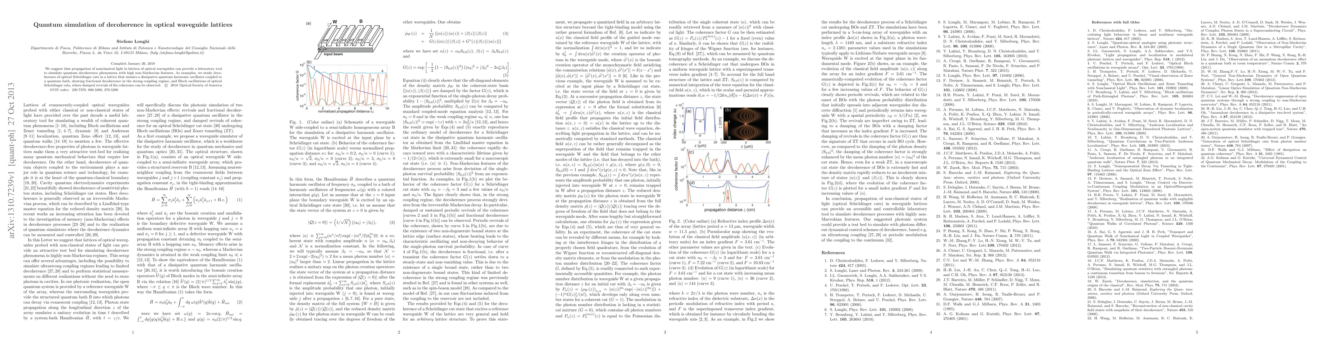 We suggest that propagation of nonclassical light in lattices of optical waveguides can provide a laboratory tool to simulate quantum decoherence phenomena with high non-Markovian features. As examples, we study decoherence of optical Schr\"{o}dinger cats in a lattice that mimics a dissipative quantum harmonic oscillator coupled to a quantum bath, showing fractional decoherence in the strong coupling regime, and Bloch oscillations of optical Schr\"{o}dinger cats, where damped revivals of the coherence can be observed.