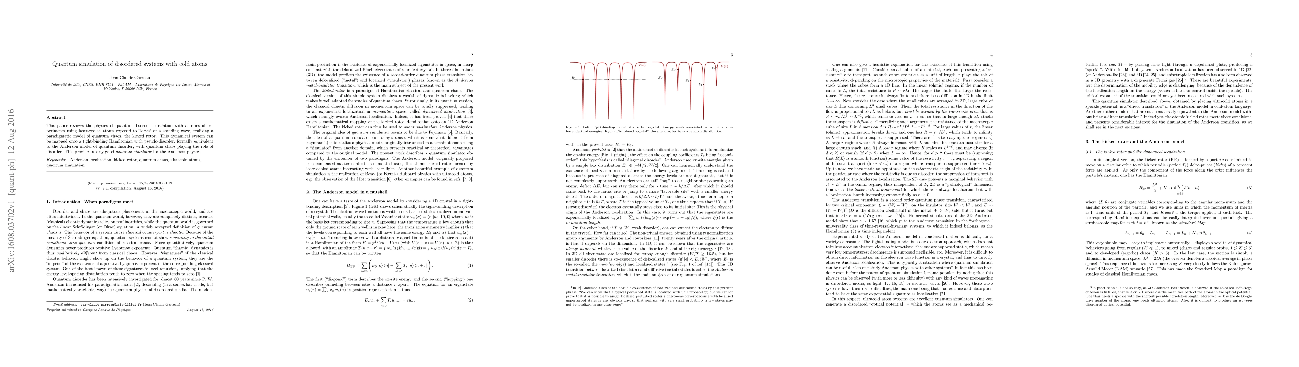 This paper reviews the physics of quantum disorder in relation with a series of experiments using laser-cooled atoms exposed to "kicks" of a standing wave, realizing a paradigmatic model of quantum chaos, the kicked rotor. This dynamical system can be mapped onto a tight-binding Hamiltonian with pseudo-disorder, formally equivalent to the Anderson model of quantum disorder, with quantum chaos playing the role of disorder. This provides a very good quantum simulator for the Anderson physics.