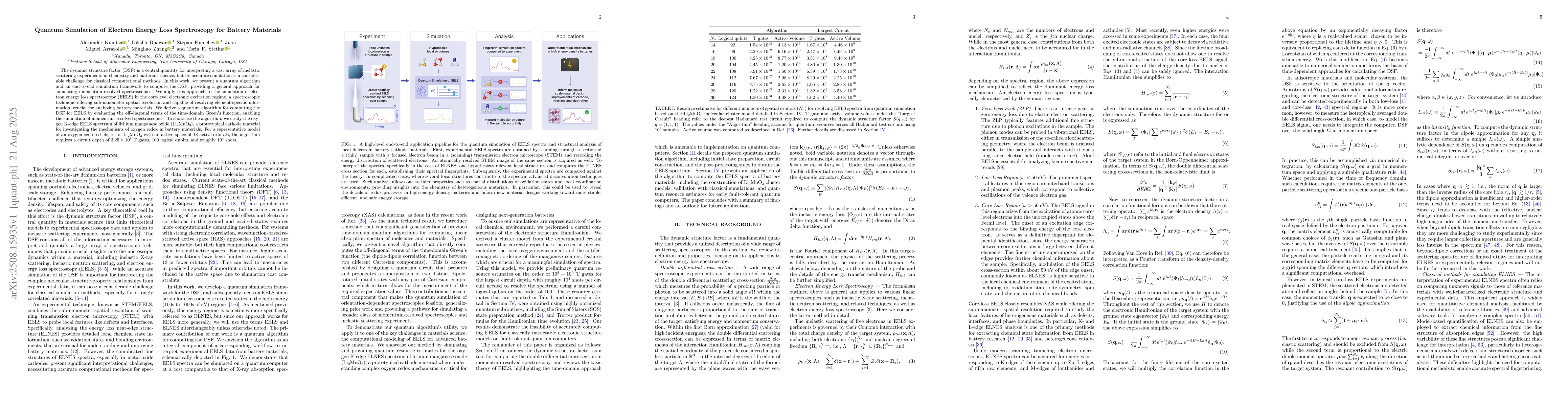 The dynamic structure factor (DSF) is a central quantity for interpreting a vast array of inelastic scattering experiments in chemistry and materials science, but its accurate simulation is a considerable challenge for classical computational methods. In this work, we present a quantum algorithm and an end-to-end simulation framework to compute the DSF, providing a general approach for simulating momentum-resolved spectroscopies. We apply this approach to the simulation of electron energy loss spectroscopy (EELS) in the core-level electronic excitation regime, a spectroscopic technique offering sub-nanometer spatial resolution and capable of resolving element-specific information, crucial for analyzing battery materials. We derive a quantum algorithm for computing the DSF for EELS by evaluating the off-diagonal terms of the time-domain Green's function, enabling the simulation of momentum-resolved spectroscopies. To showcase the algorithm, we study the oxygen K-edge EELS spectrum of lithium manganese oxide ($Li_2MnO_3$), a prototypical cathode material for investigating the mechanisms of oxygen redox in battery materials. For a representative model of an oxygen-centered cluster of $Li_2MnO_3$ with an active space of 18 active orbitals, the algorithm requires a circuit depth of $3.25\times10^{8}$ T gates, 100 logical qubits, and roughly $10^4$ shots.
