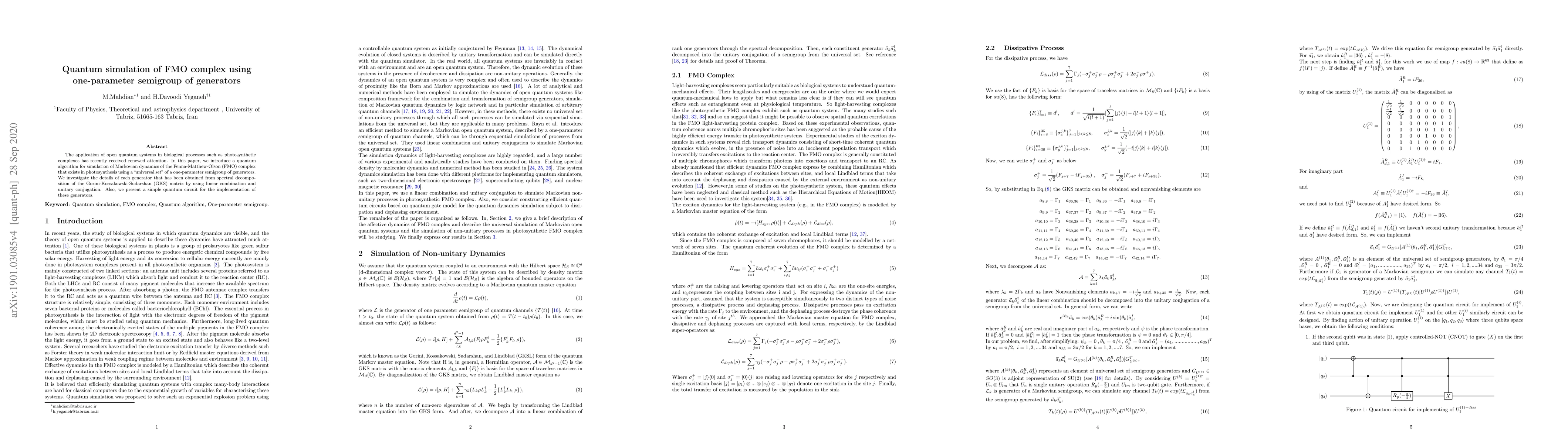 This paper presents a quantum algorithm for simulating the Markovian dynamics of the FMO complex in photosynthesis using a one-parameter semigroup of generators derived from the GKS matrix. The study details each generator and proposes a simple quantum circuit for their implementation.