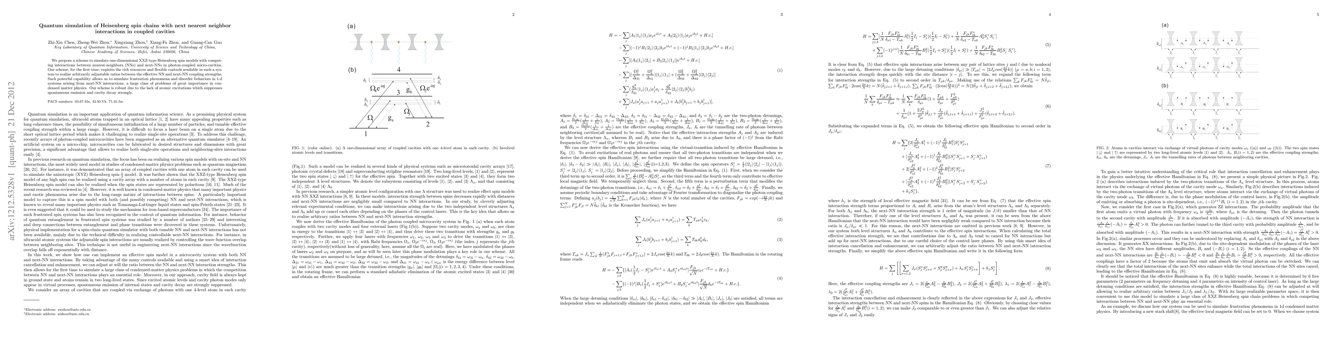 Researchers propose a scheme to simulate 1D Heisenberg spin chains with next nearest neighbor interactions in photon-coupled micro-cavities, enabling the study of frustration phenomena and disorder behaviors.