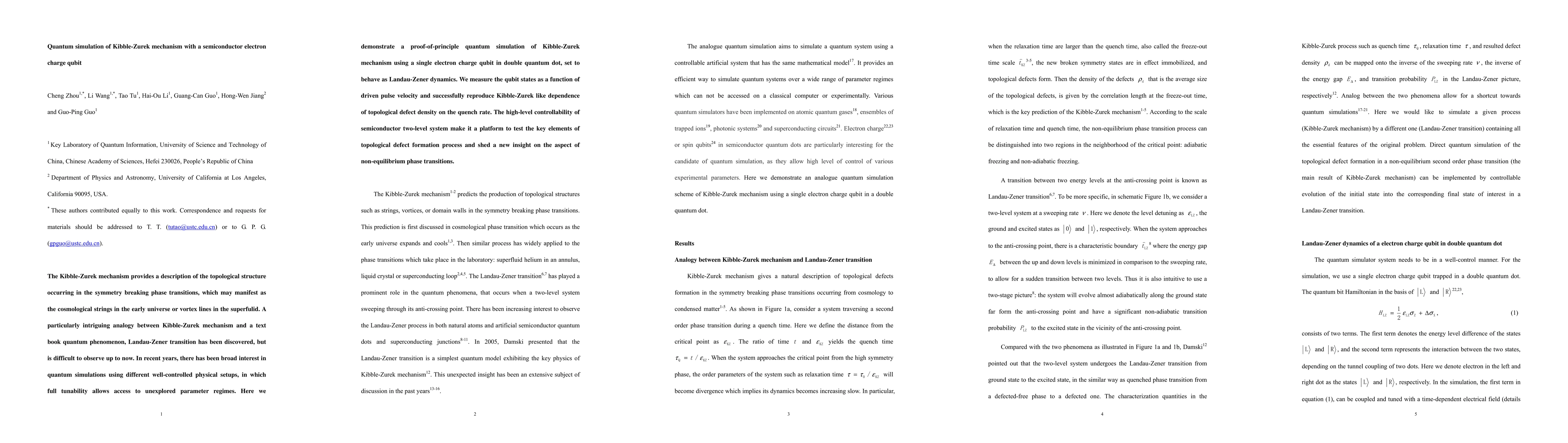 This paper demonstrates a quantum simulation of the Kibble-Zurek mechanism using a semiconductor electron charge qubit in a double quantum dot, mimicking Landau-Zener transitions. The study successfully reproduces the Kibble-Zurek scaling of topological defect density with quench rate, offering insights into non-equilibrium phase transitions.